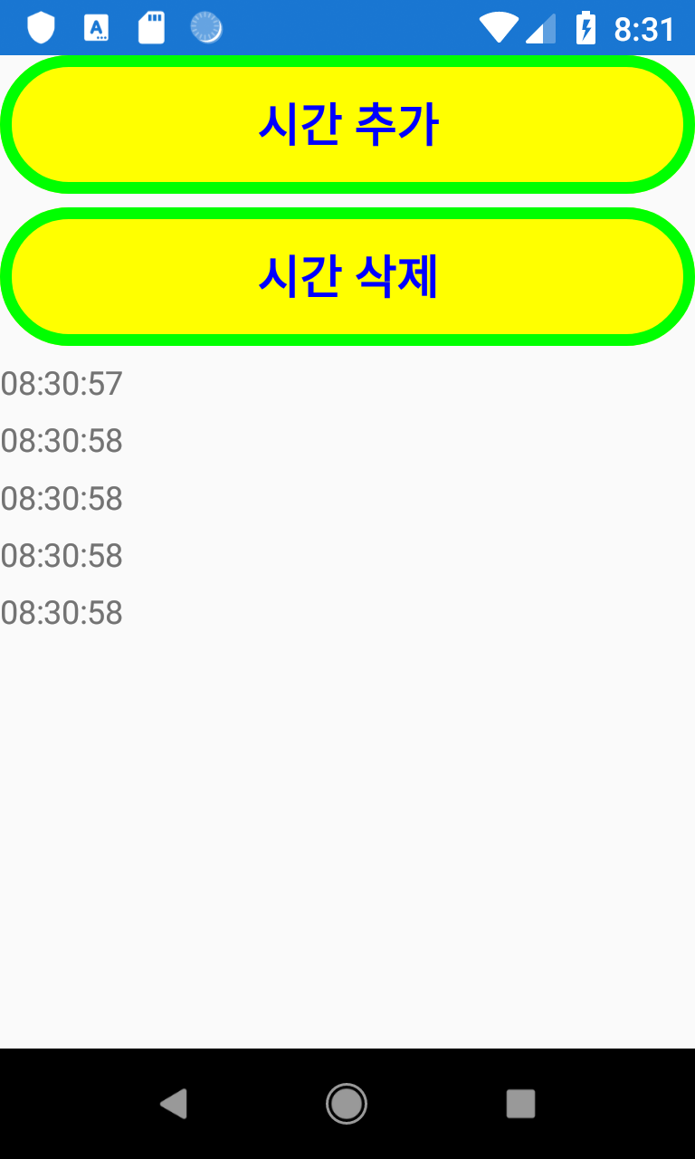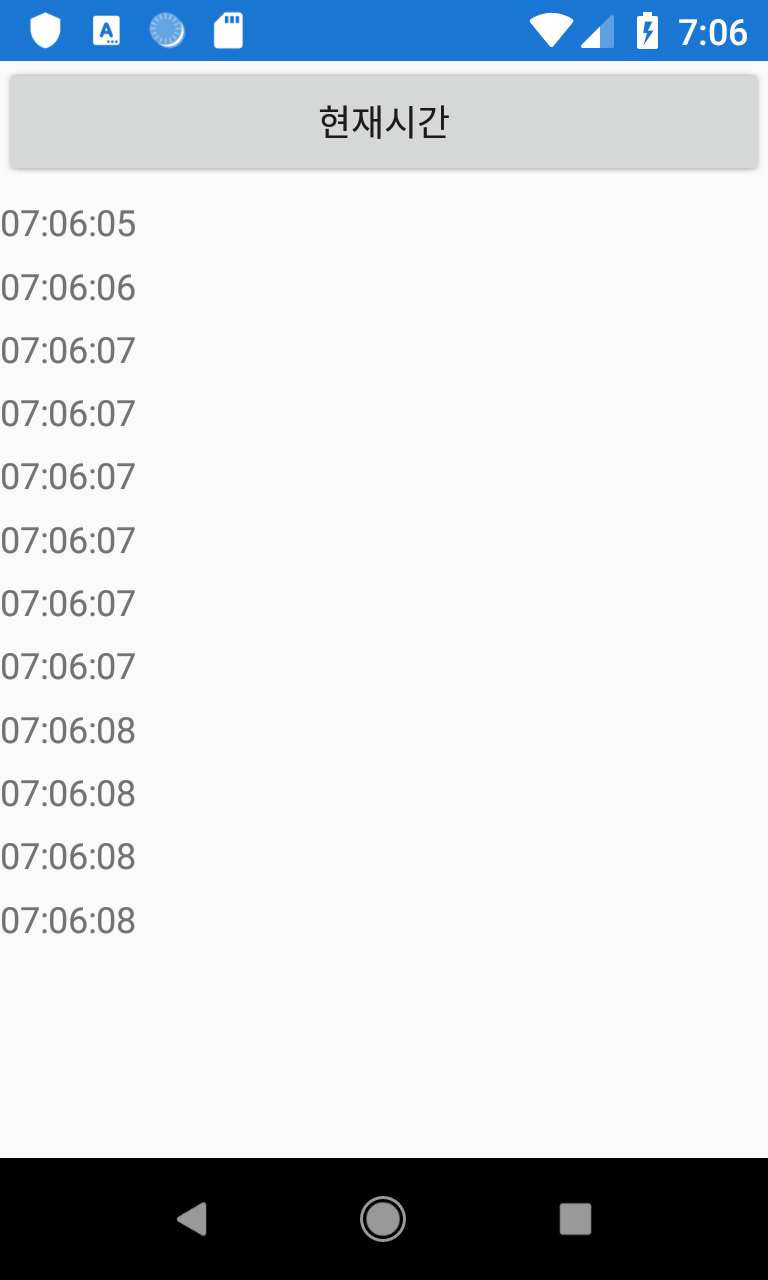 이제 버튼 이벤트를 배웠으니 한가지 간단한 앱을 만들어 보자. 버튼을 누르면 현재 시간을 찍어주는 앱을 만들어 보겠다. Button 이벤트를 등록하고 클릭할때마다 lable이 추가하는 형태로 코딩되어 있다. 스톱워치 기능 구현할때 이와 같이 구현하면 되겠다.