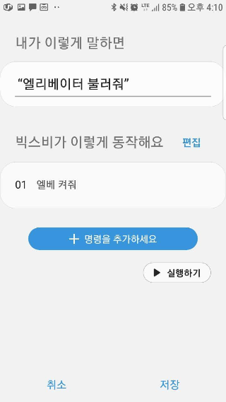 이제 원래 주제였던 갤홈미니로 제어해봐야겠죠? 갤홈미니는 Smartthings 에 설치해주는것만으로도 사용이 가능합니다. 즉 설정이 필요없습니다. 다만, 엘리베이터같은 경우, 스위치로 인식되기때문에 호출할때 "엘리베이터 켜줘" 라고 말을 해주어야 합니다. 뭔가 어감이 이상하죠? 그래서 갤홈미니에는 단축명령어라는것이 있습니다.