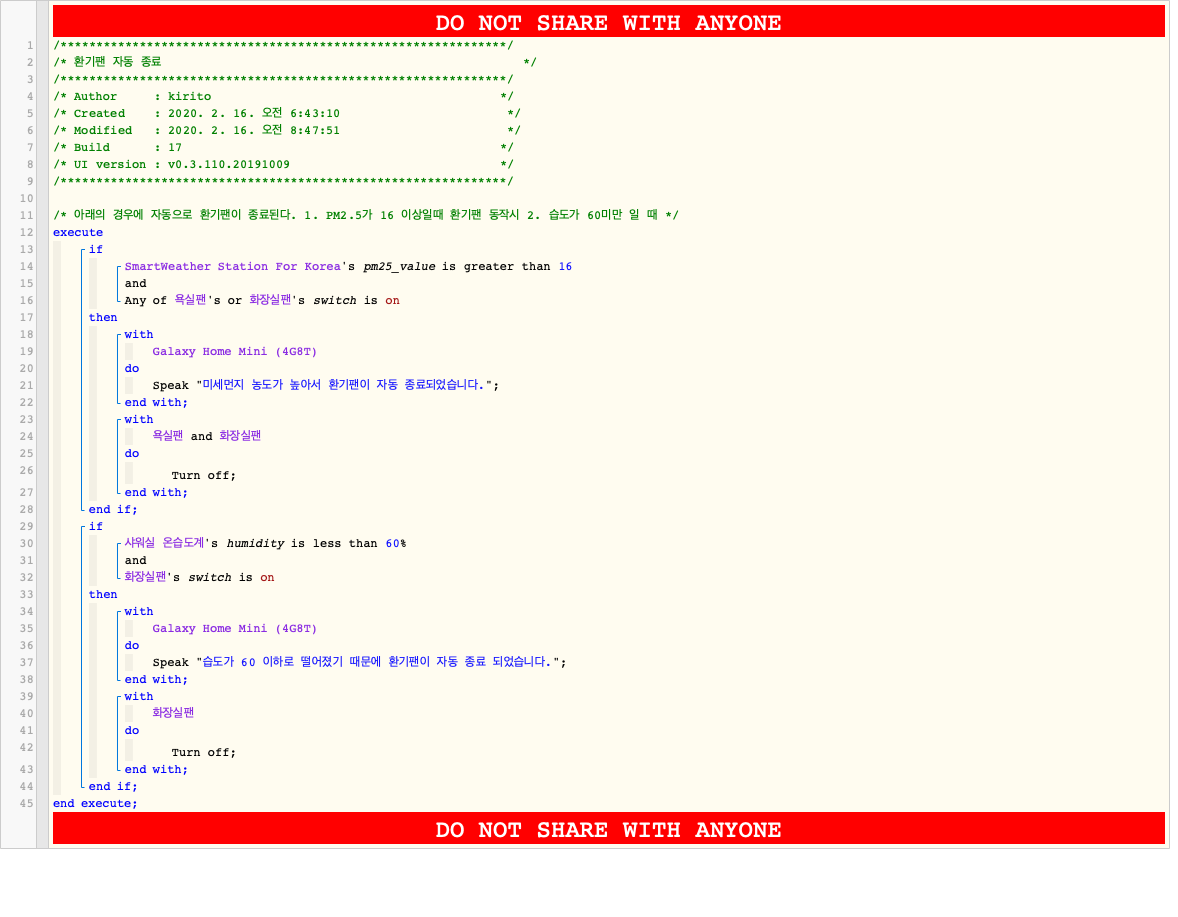 - 29~32 : 만약 샤워실 온습도계의 습도가 60% 미만이고 화장실팬의 스위치가 ON이면(샤워실에는 온습도계가 없어서 뺐습니다ㅠㅠ)