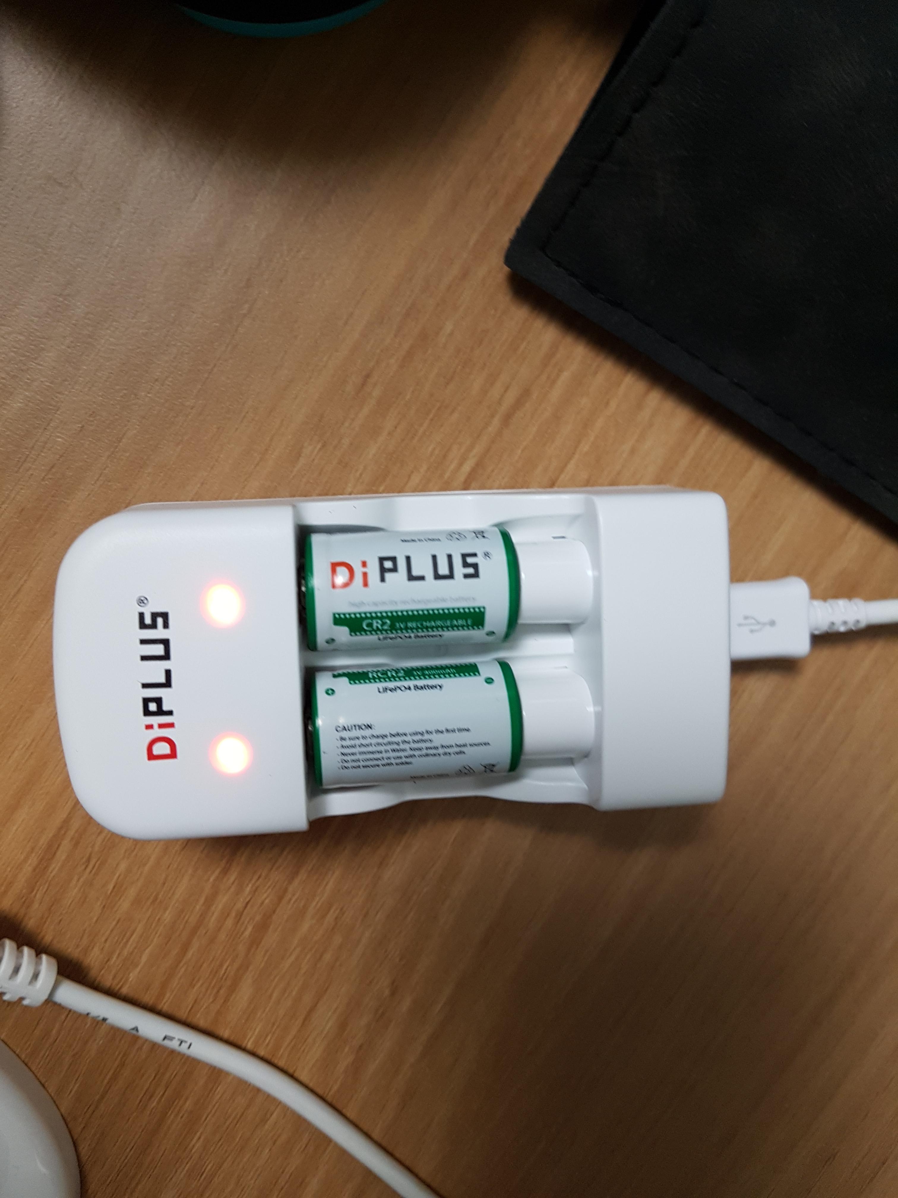 스위치봇은 CR2라는 배터리를 사용하는데 옛날 필름카메라시절 배터리라고 합니다. 막상 꺼내보니 꽤 귀엽게 생겼더군요. CR2단품 배터리가 천얼마 했던거 같은데 배송비도 있고 앞으로 평생 쓸거 같아서 충전이 되는 배터리 2개와 충전기를 쿠팡에서 주문했습니다. 가격은 2만원 정도 비써지만 약 1000회까지 충전 가능하다니 제거 60살 될때까지 사용이 가능할것 같습니다. 충전기도 cr2귀여움을 물려 받은듯 앙증맞아 보였습니다. 마이크로 5핀으로 충전할 수 있습니다. cr2 2개를 끼어놓고 전원선을 연결하니 붉은색 LED가 점등되었습니다.