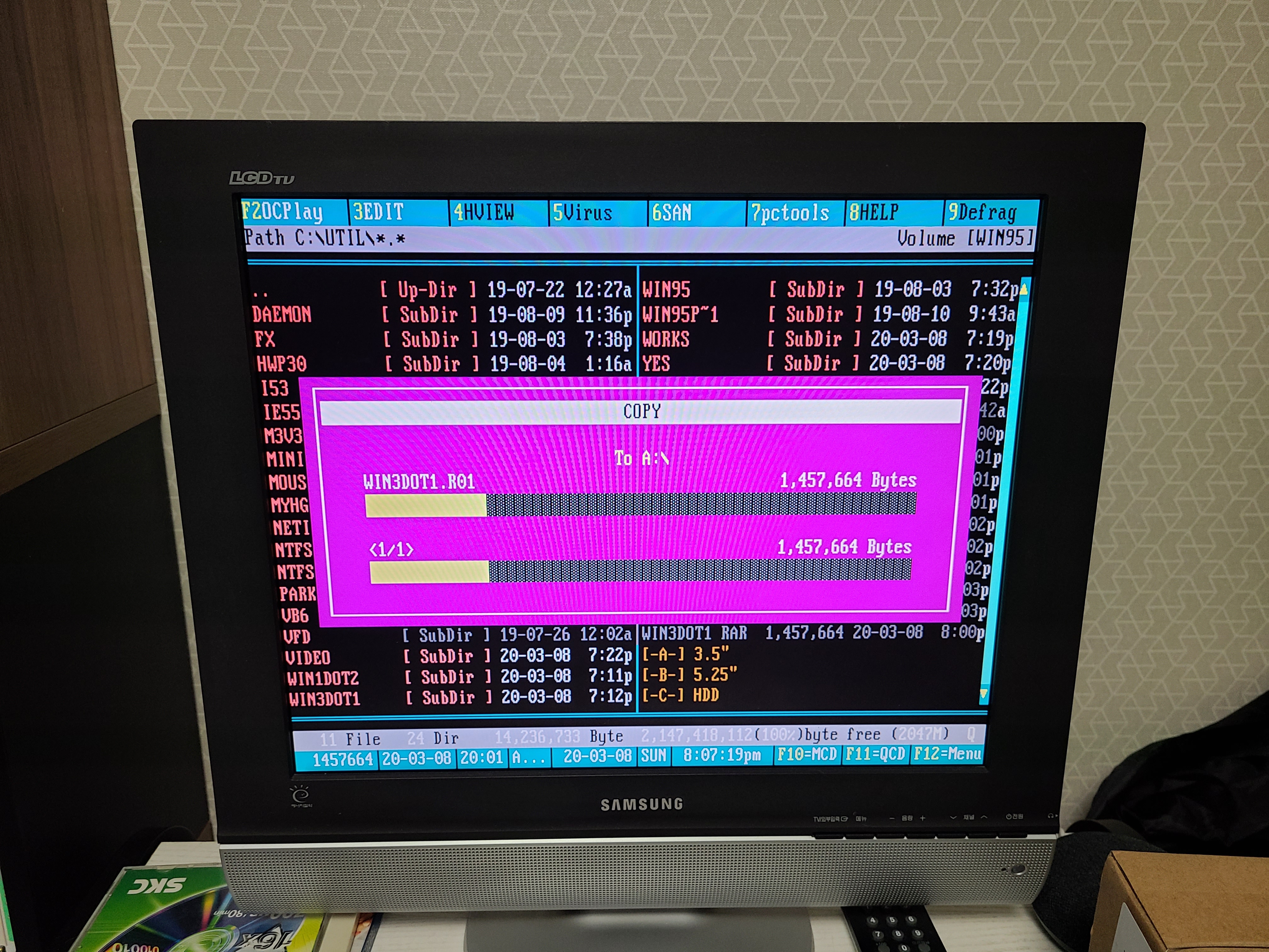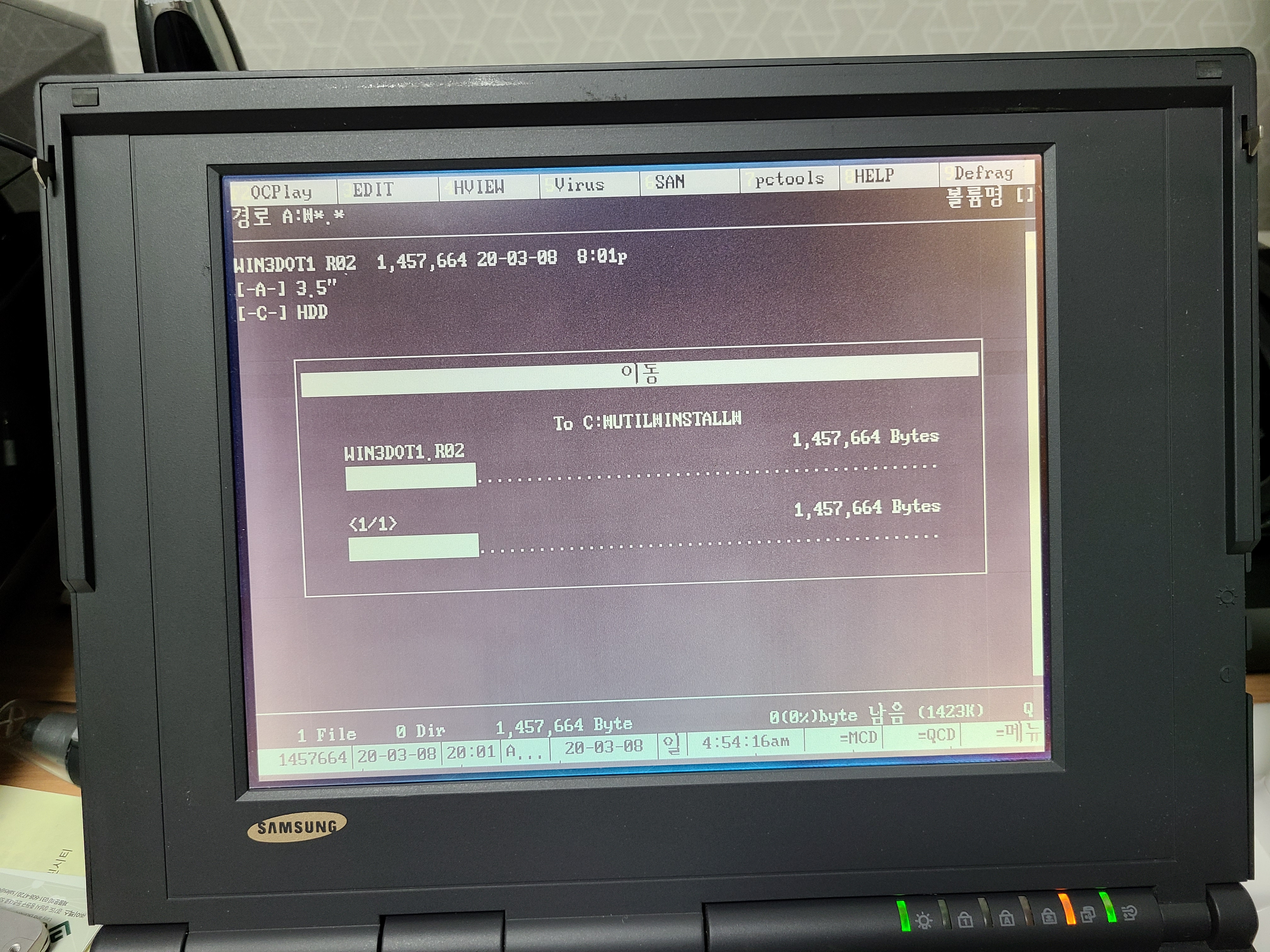 도스에서만 사용하다가 흑백 노트북에서 윈도우 3.1을 써보면 어떨까 해서 도전해보았습니다. 기존 가지고 있던 매직스테이션에 인터넷에서 다운받은 윈도우3.1 설치파일을 복사해두었습니다. rar로 1.44MB 씩 분할압축했더니 총 9개의 파일이 나왔습니다. 이제 총 9번 옮기면 되겠네요
