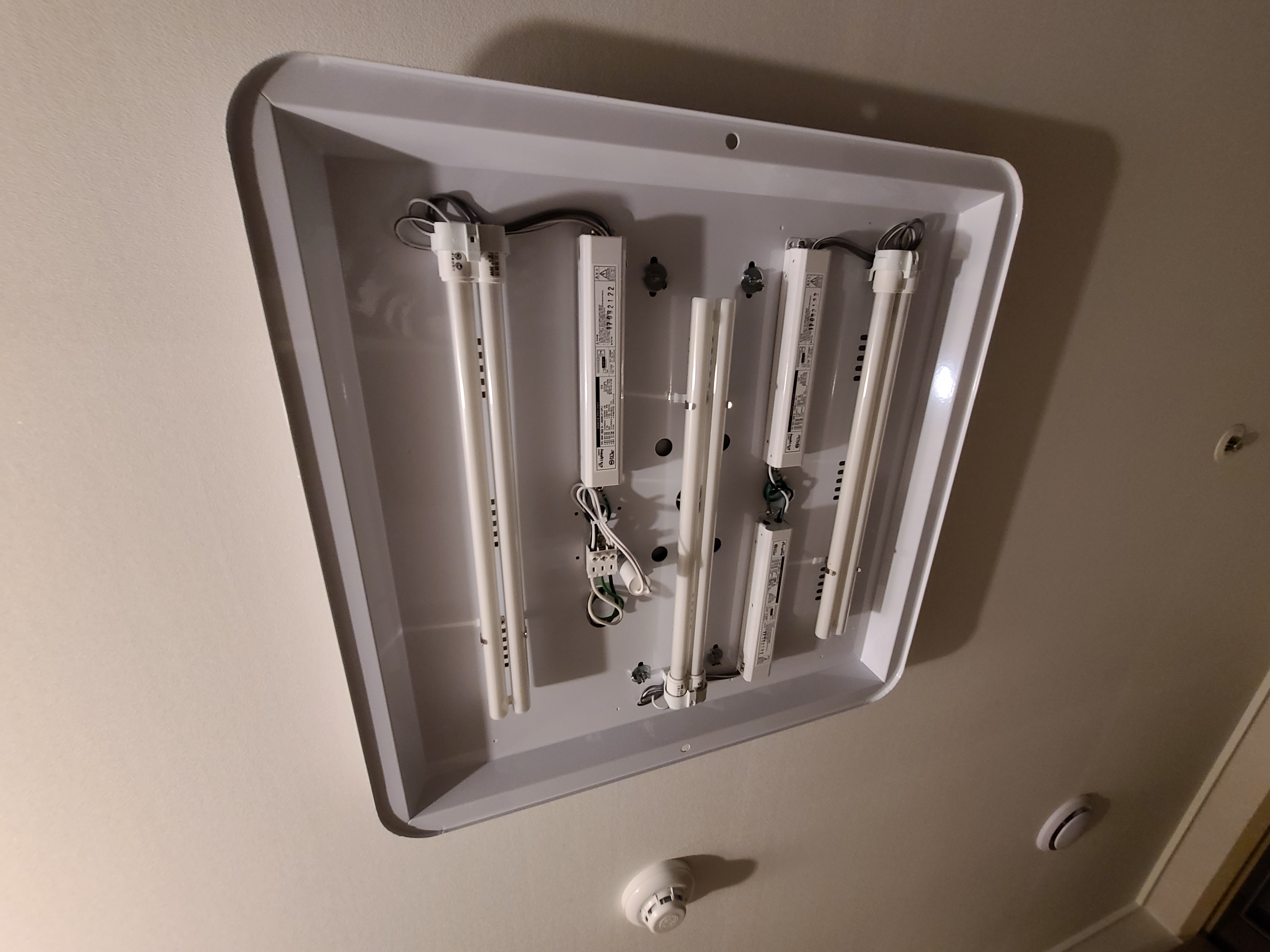 3. 아래 사진을 보면 엄청 복잡하게 되어 있는데 천장에서 3개선이 내려와 형광등이라서 여러개로 나눠진것입니다. 우린 천장에서 내려온 3가닥 선만 집중하면 됩니다. 고정 너트가 있는데 이걸 돌려서 빼줍니다. 이때 한손은 전등을 들고 있어야 합니다. 안 그럼 너트가 다 풀어져 전등이 추락 할 수 있으니까요. 팔이 아파도 한손은 꼭 전등이 떨어지지 않도록 받쳐주세요.