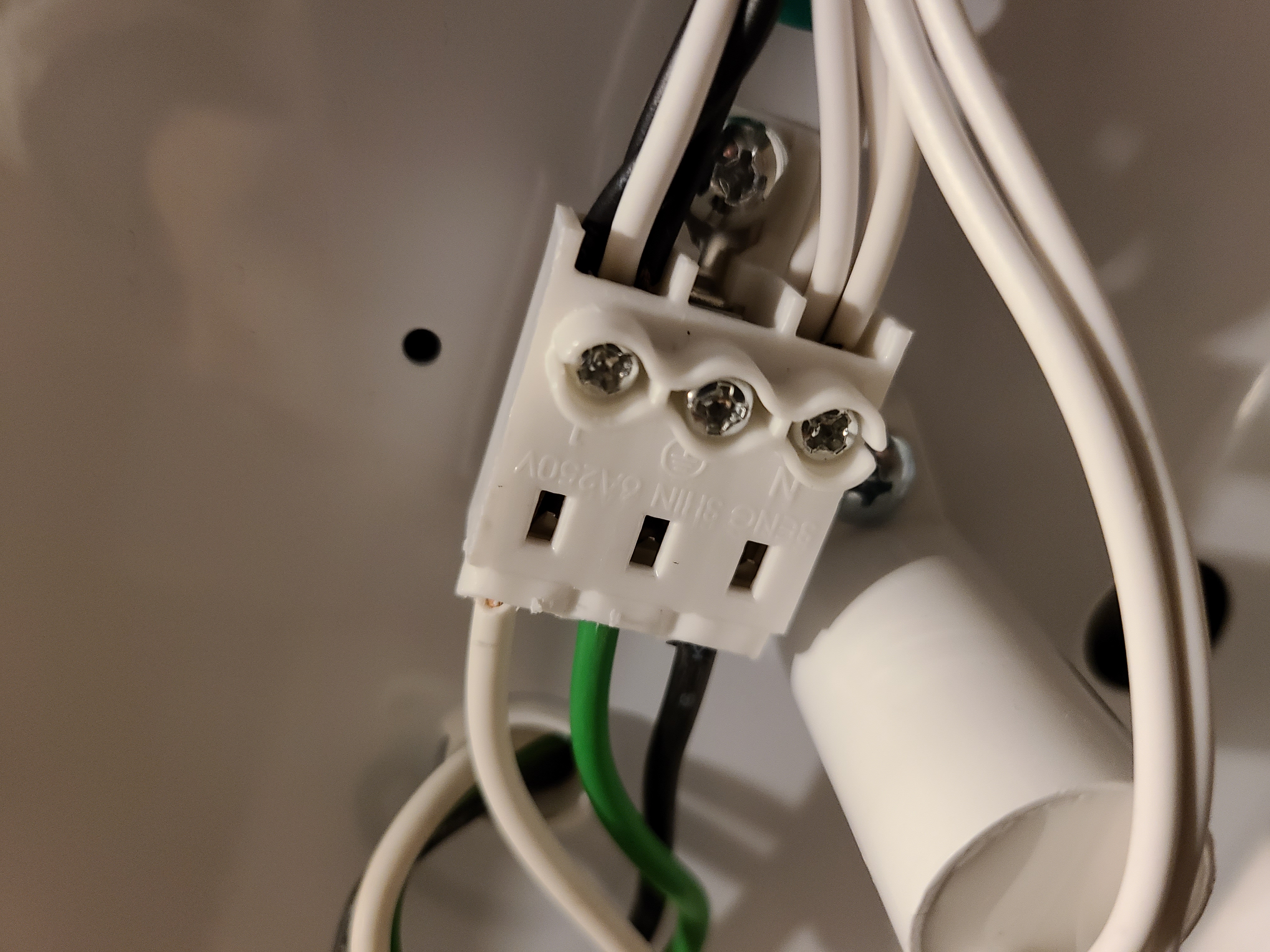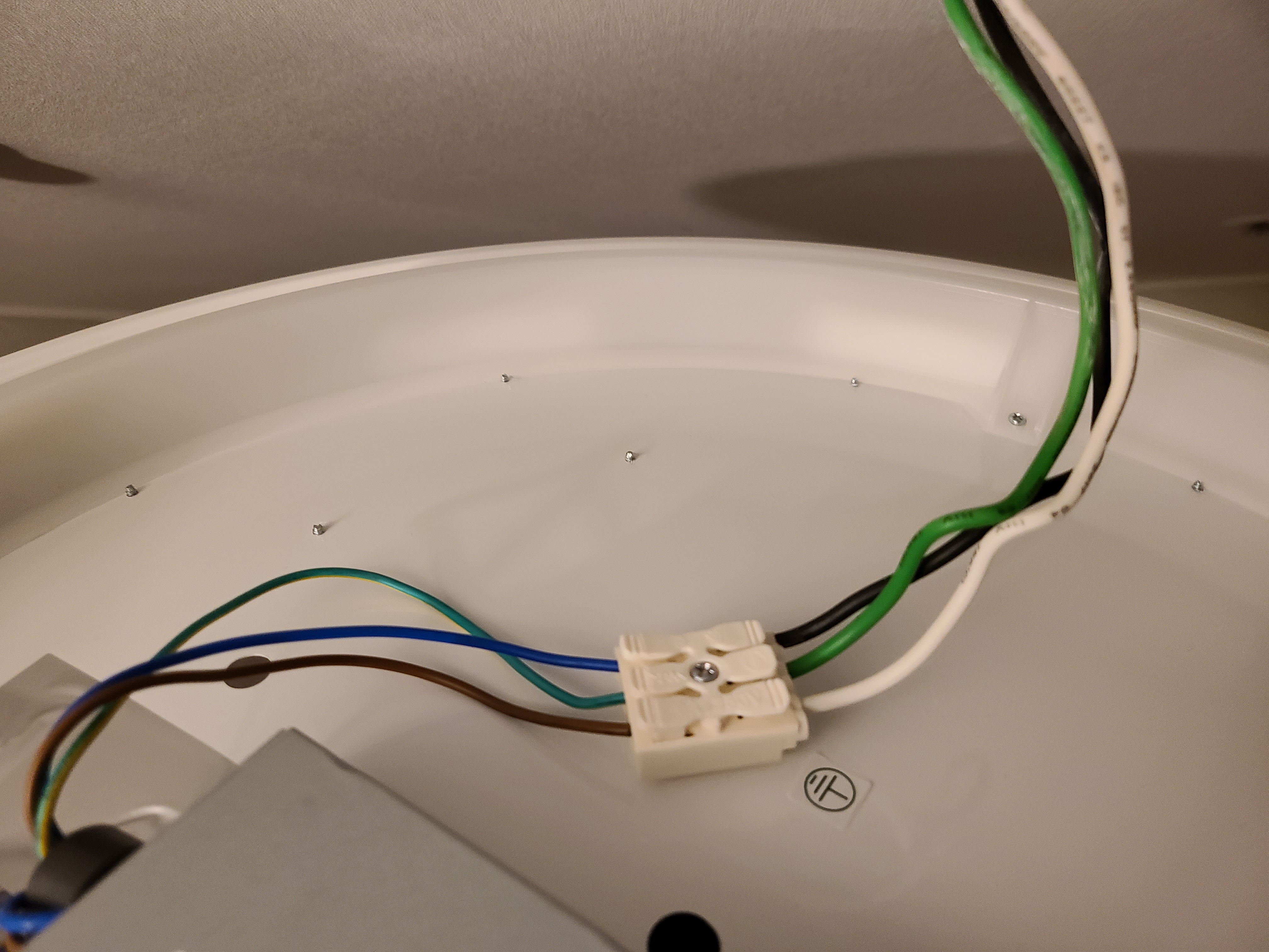 6. 이제 iot등을 올릴차례입니다. iot등을 올리고 전선을 연결해줍니다. iot등은 가운데가 그라운드입니다. 위에서 녹색이 그라운드였죠? 그걸 가운데 연결하고 L에는 흰색 N에는 검정색을 연결하면 배선은 끝입니다.