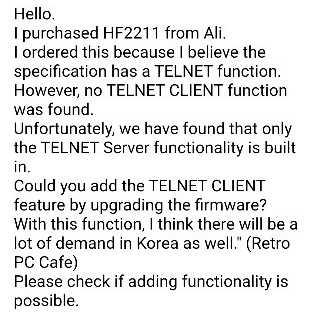 HF2211은 펌웨어 업데이트 기능을 지원하기때문에 혹시 몰라서 제작사에 텔넷기능을 넣어줄 수 없냐고 문의해놓은 상태입니다. 문의 내용은 아래와 같습니다.