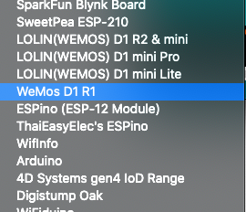 툴 -> 스케치 -> 보드를 선택하시면 WeMos D1 R1 이 표시되는데 이것을 선택하면 됩니다.