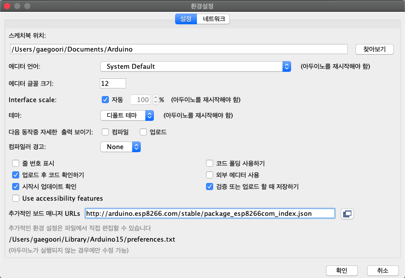 Arduino -> Preference을 실행 시킨후, 추가적인 보드 매니저 URLs에 아래와 같이 추가해줍니다.