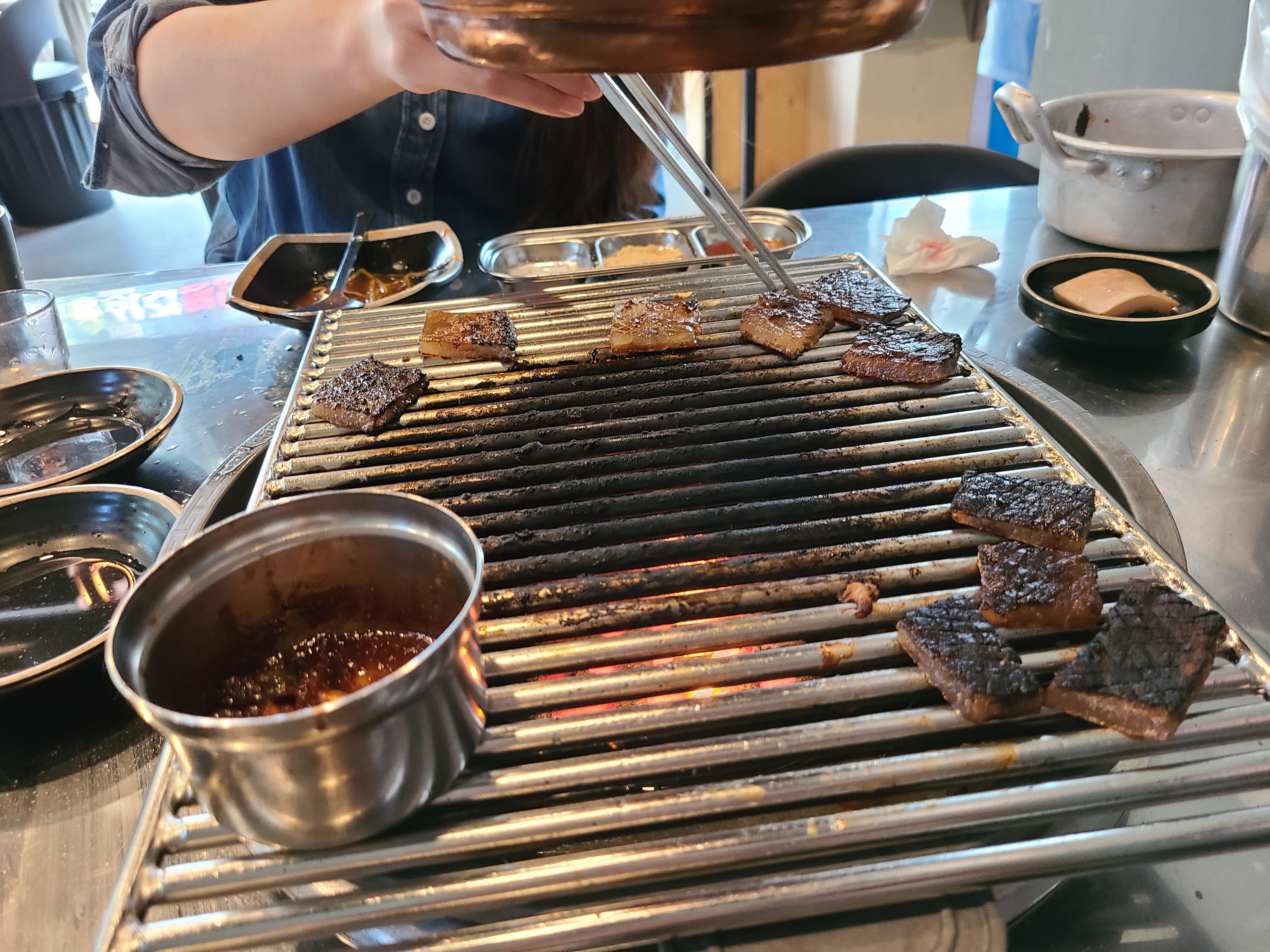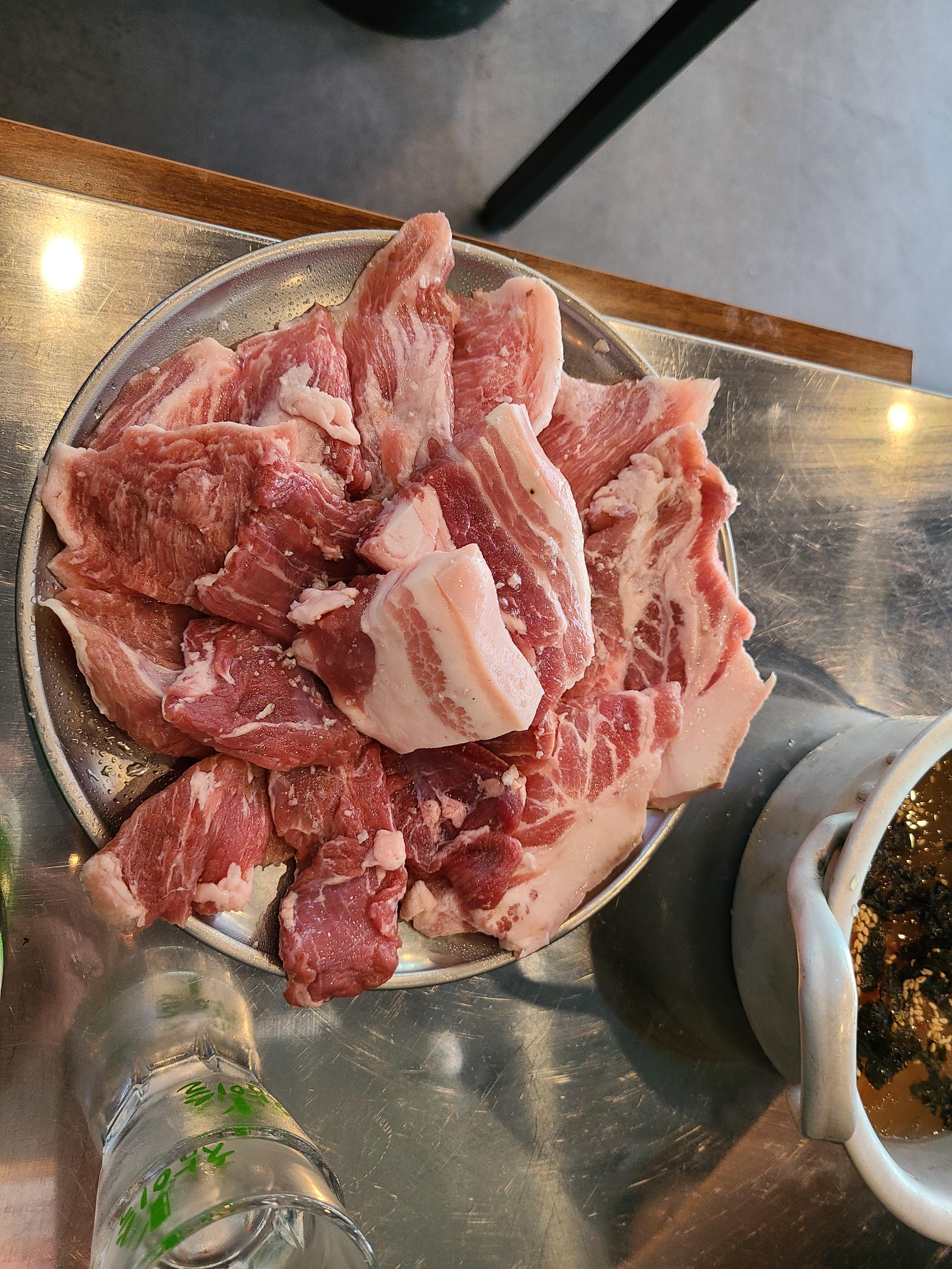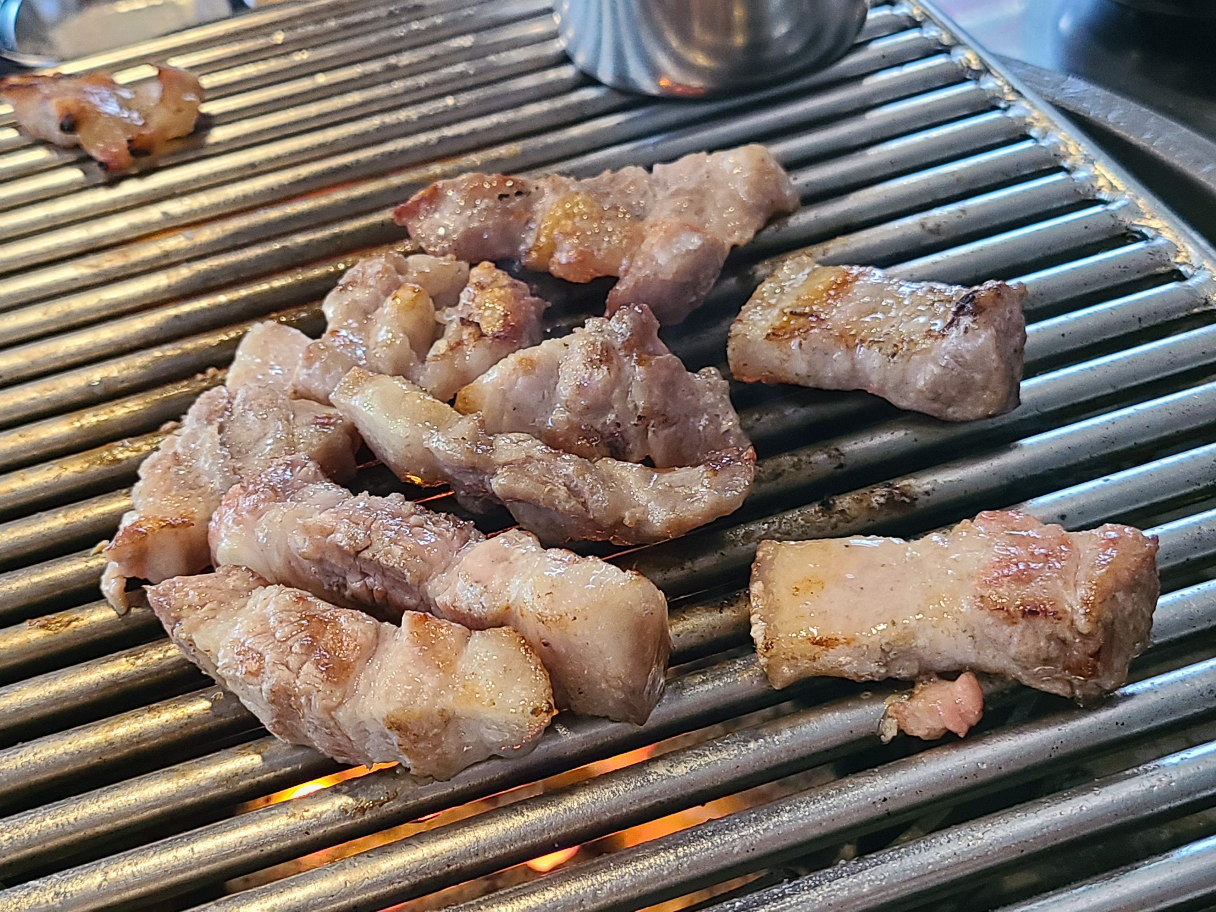 6. 하나하나 지글지글 굽고 소주 한잔을 곁들였다. 한가지 아쉬운점은 상추가 없다는것이다. 본인은 상추에 싸먹는곳을 좋아한다.