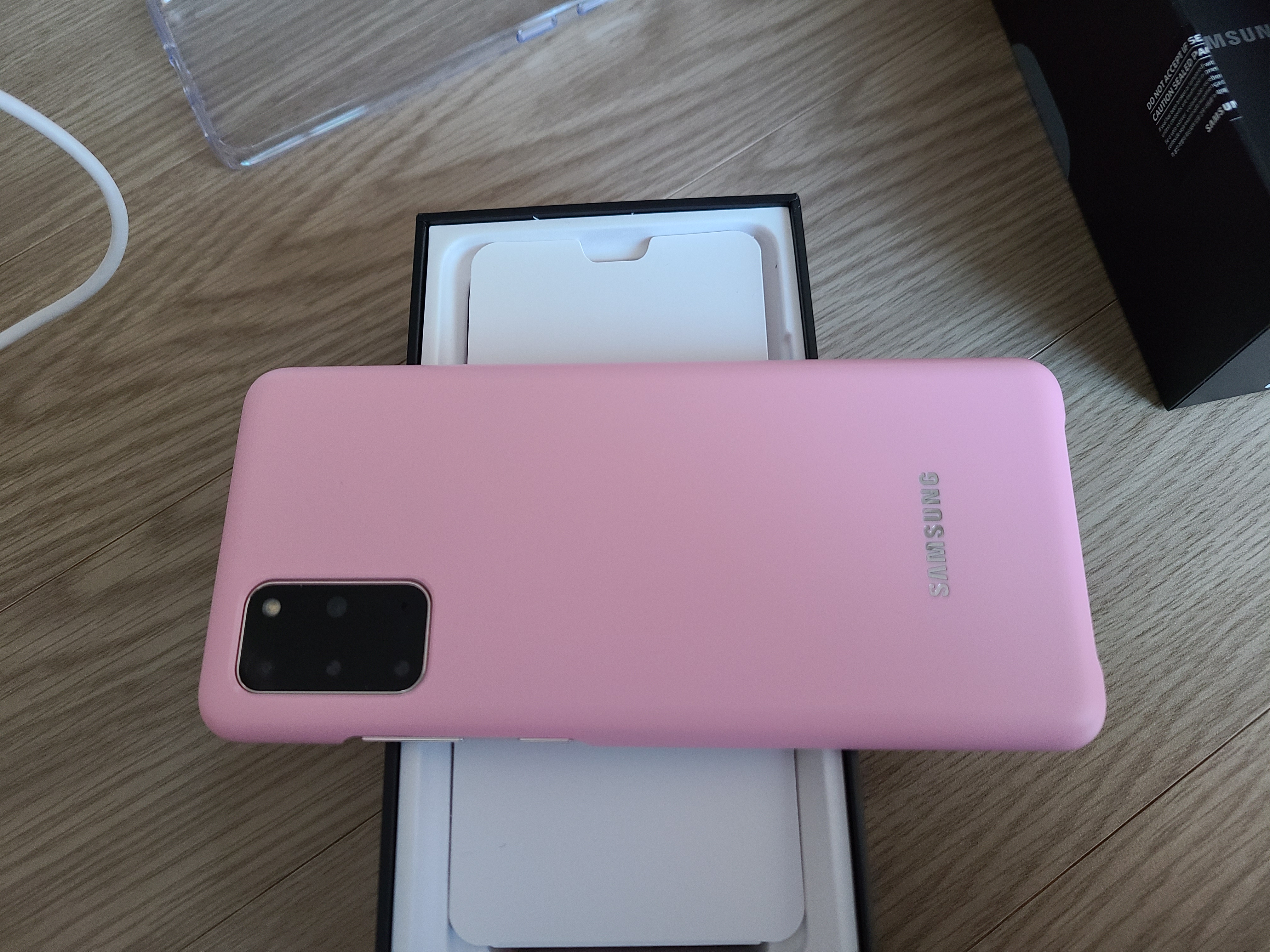 박스를 열고 S20을 보았습니다. 정면에서 보았을때 테두리부분을 빼돈 동일하였습니다. 유리에는 액정보호필름이 기본 장착되어있습니다. 만약 싸제(?)로 바꾸신다면 초음파 지문센서가 사용 가능한 제품인지 확인하고 교체해주세요.