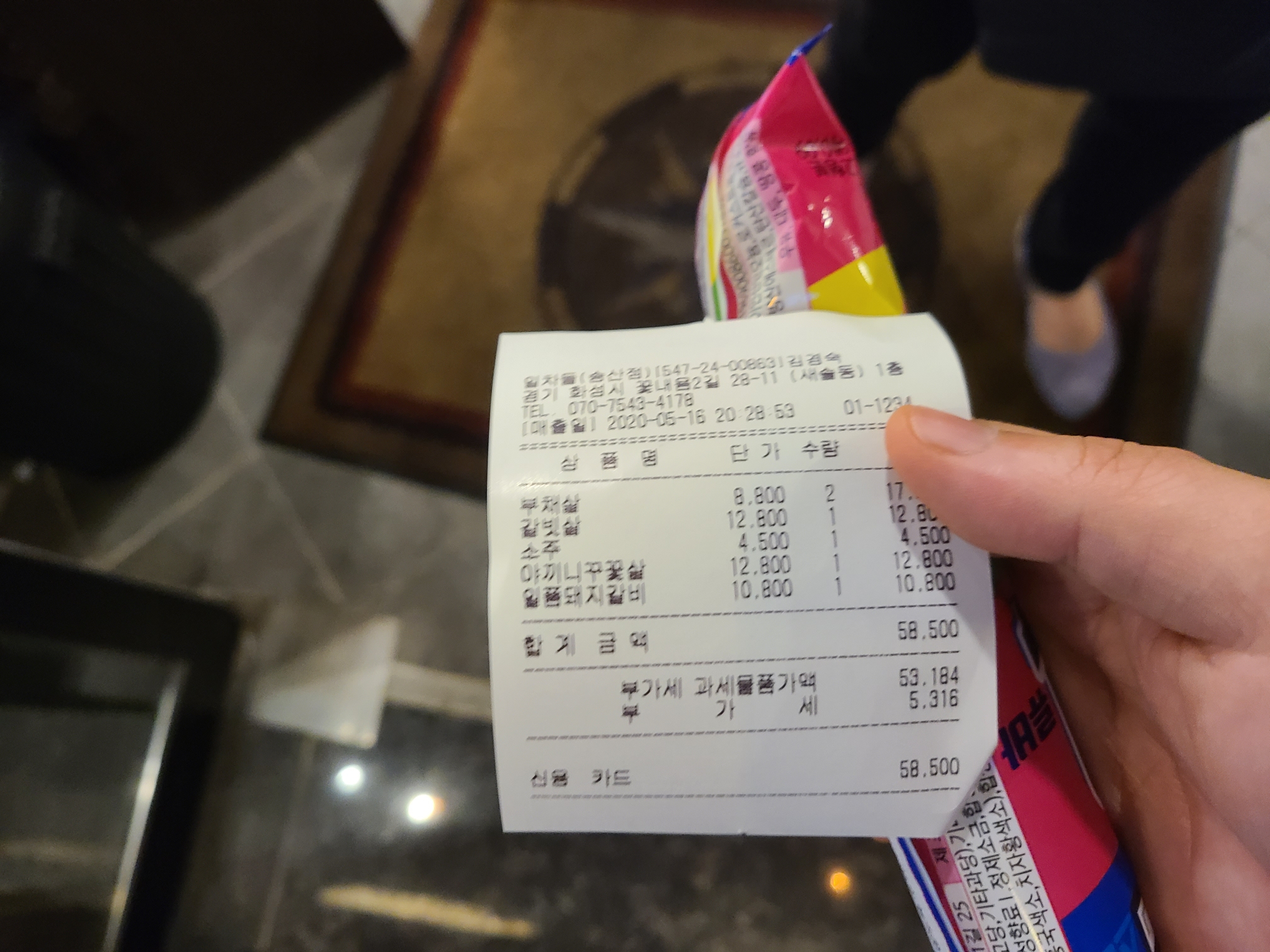 9. 2명이서 소주1병에 고기만 5인분(750g) 먹었는데도 5만8천원 우어어 개저렴하고 맛있넹요^^