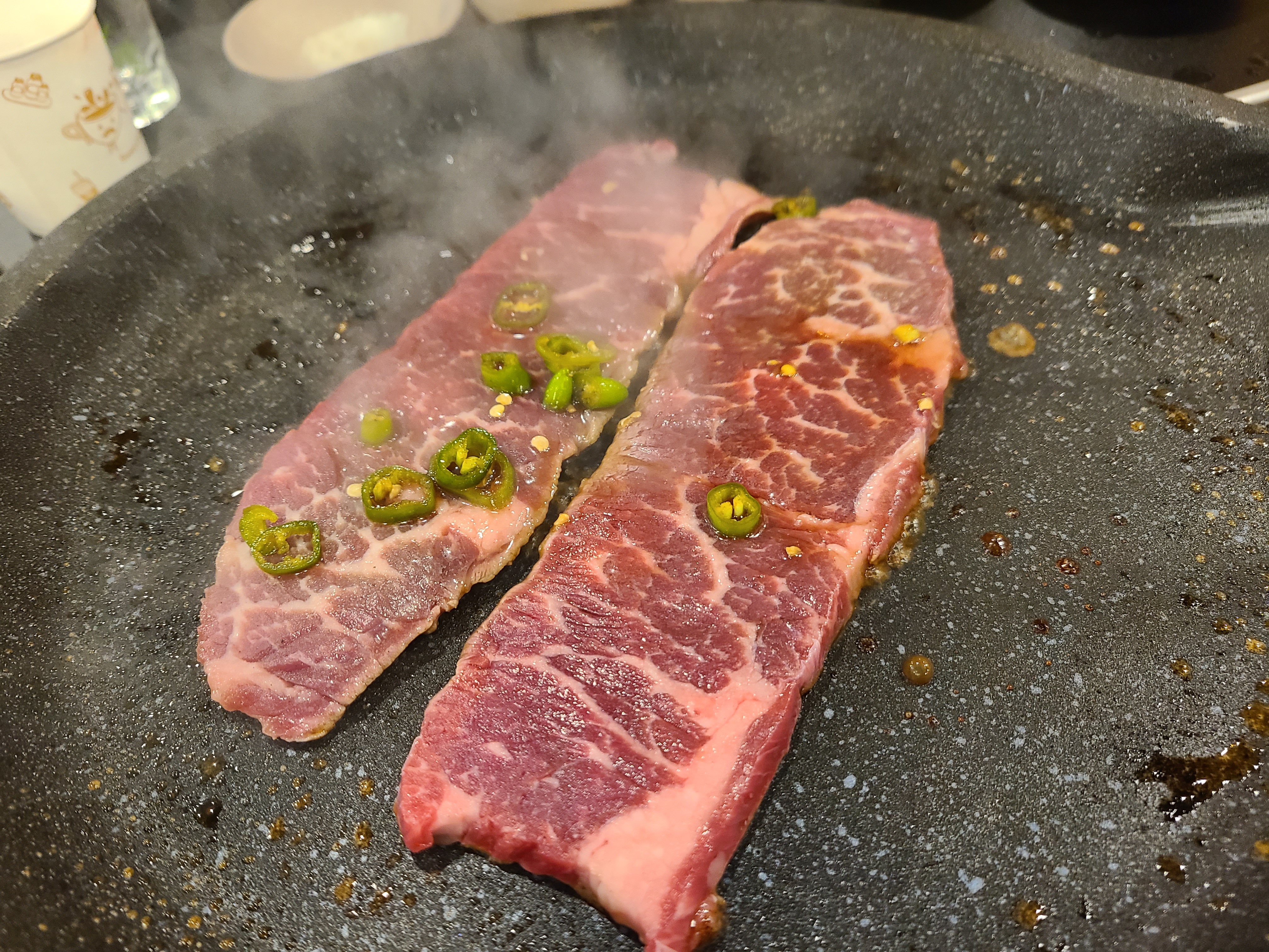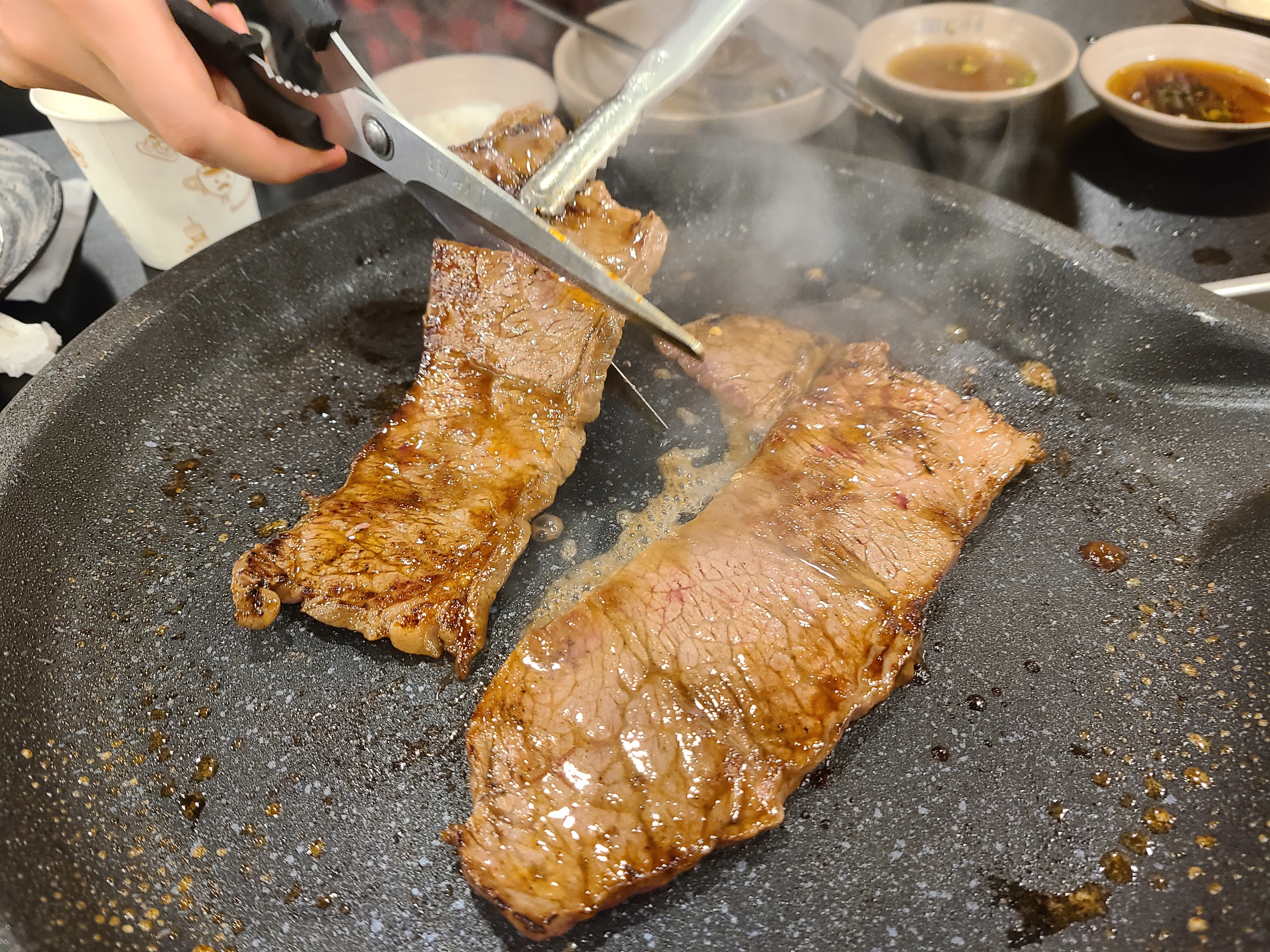 4. 부채살은 마블링이 엄청 잘되어 있었습니다. 고기가 이쁘다라고 생각이 들더군요. 가위로 굳이 자를필요없이 한입에 쏘옥 들어가고 냉동고기가 아니라 이차돌 부채살보다 훨씬 맛이 좋았습니다.