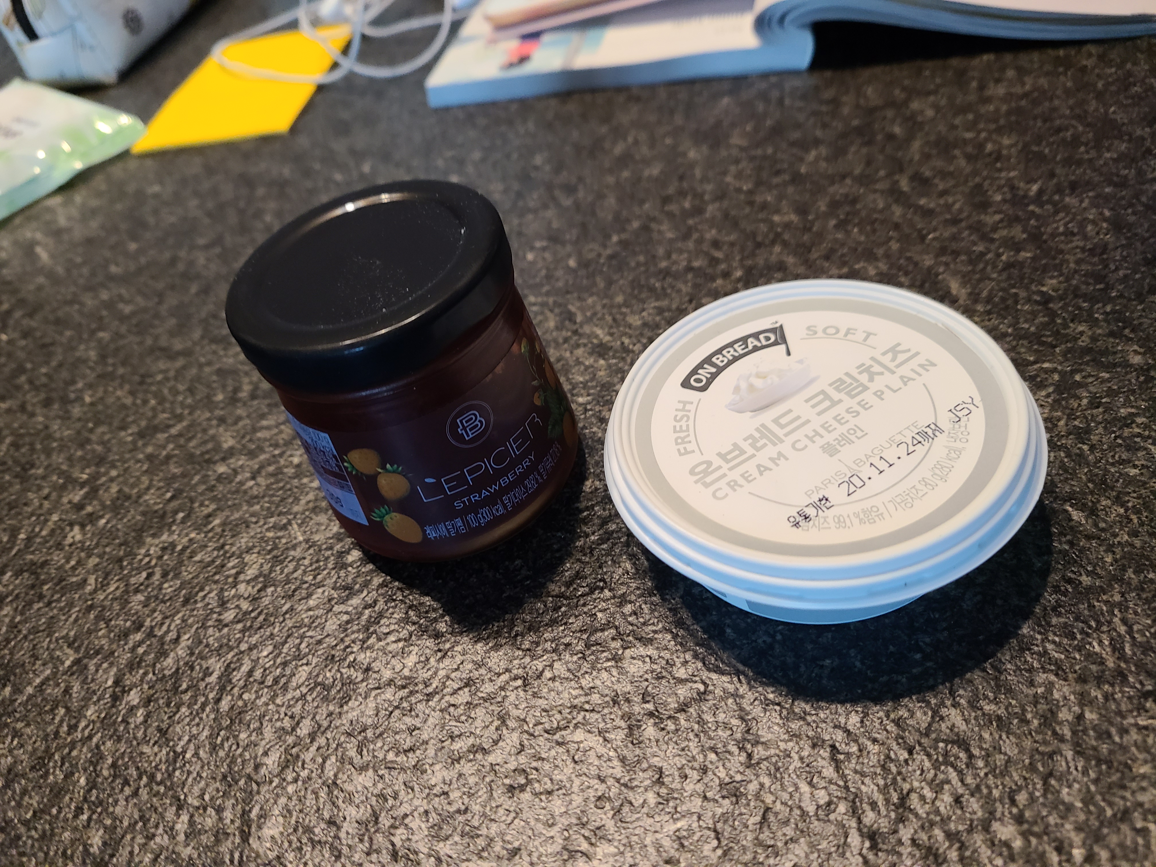 빵이 다 굽기전에 파리바게트에서 산 딸기잼과 크림치즈를 준비해둡니다.