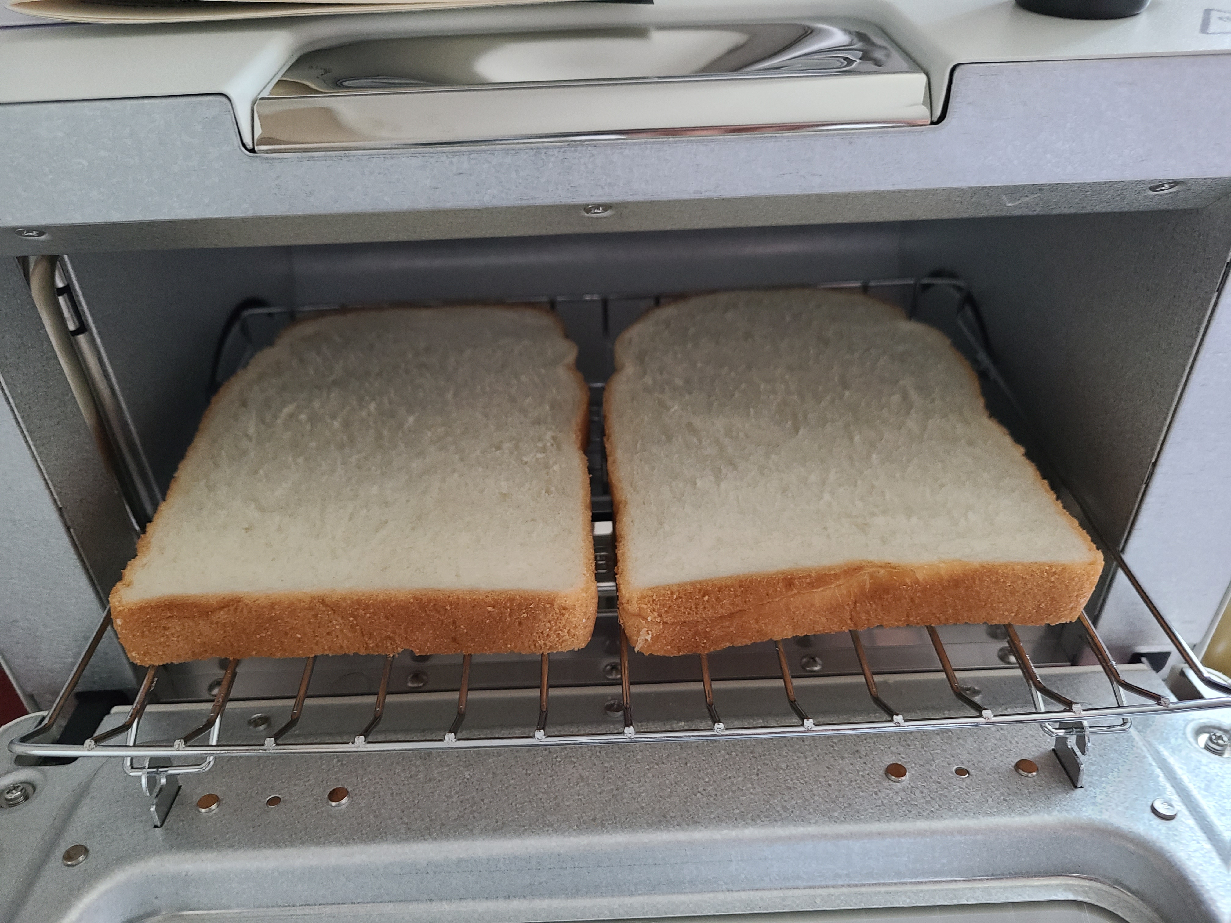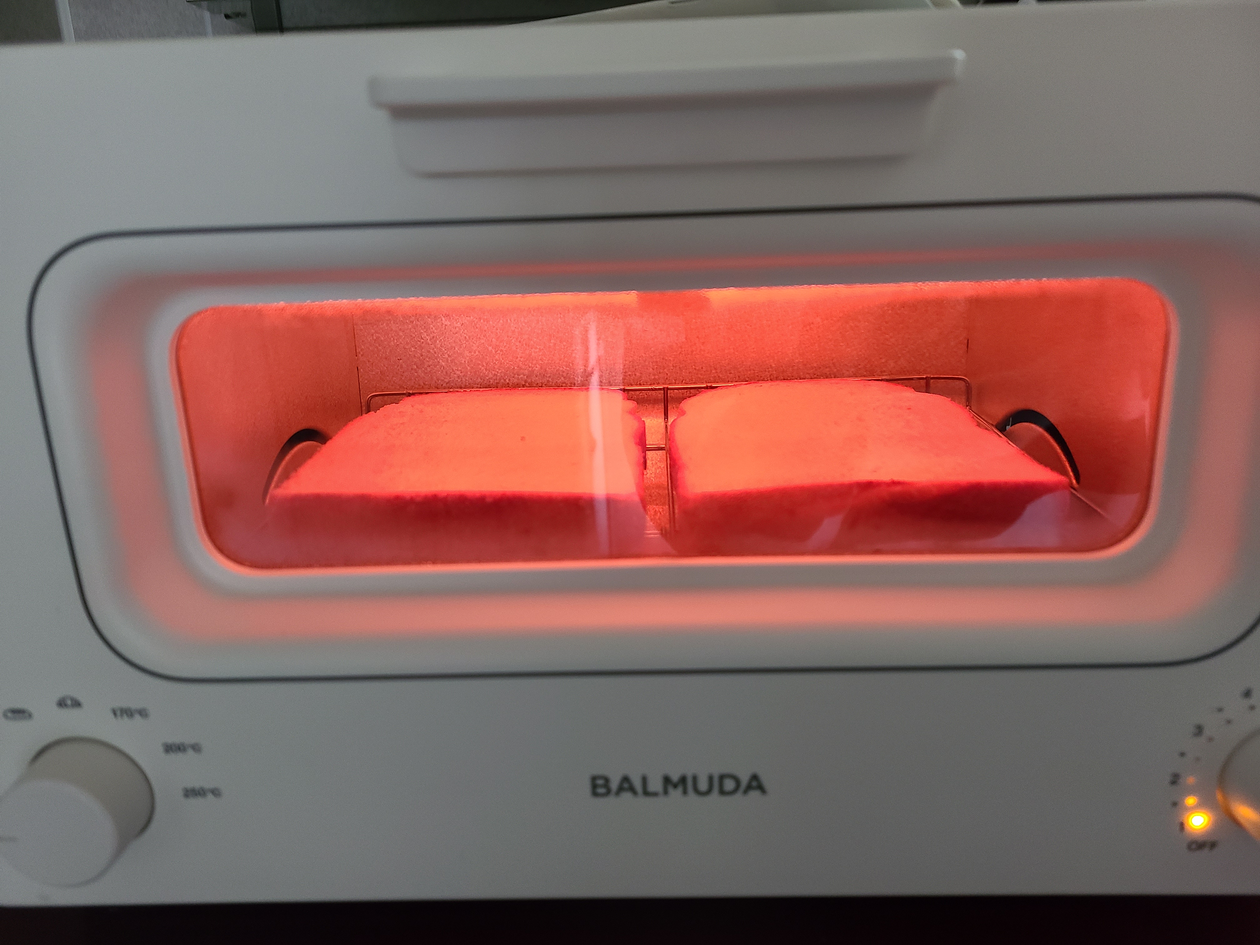 보통 토스트기하면 위에서 아래로 넣는 토스트기를 생각할수 있는데 발뮤다는 옆으로 넣는 형태 약간 오븐기 느낌이 듭니다. 열선도 아래로 배치되어 있어서 뒤집을 필요가 없습니다.