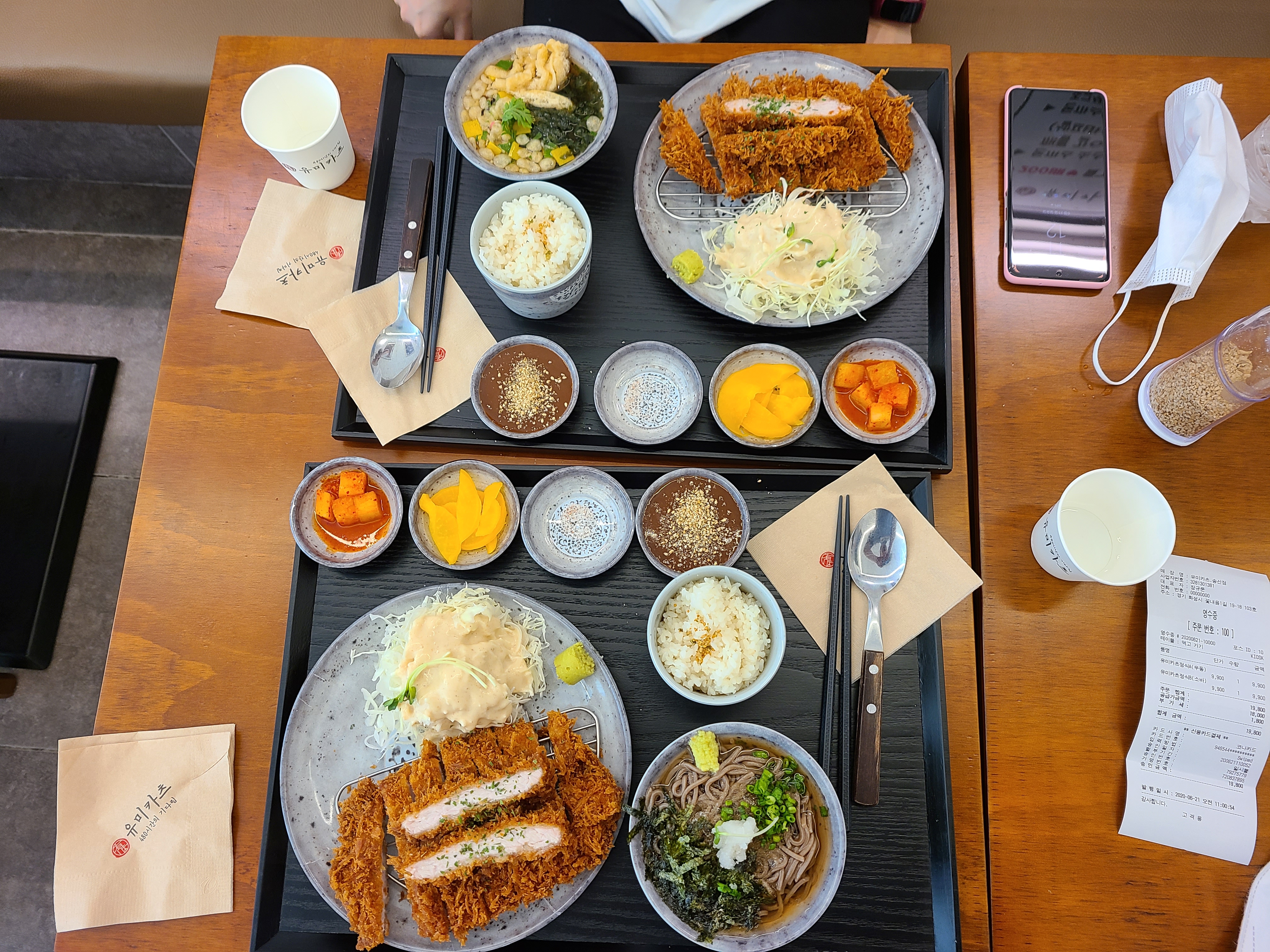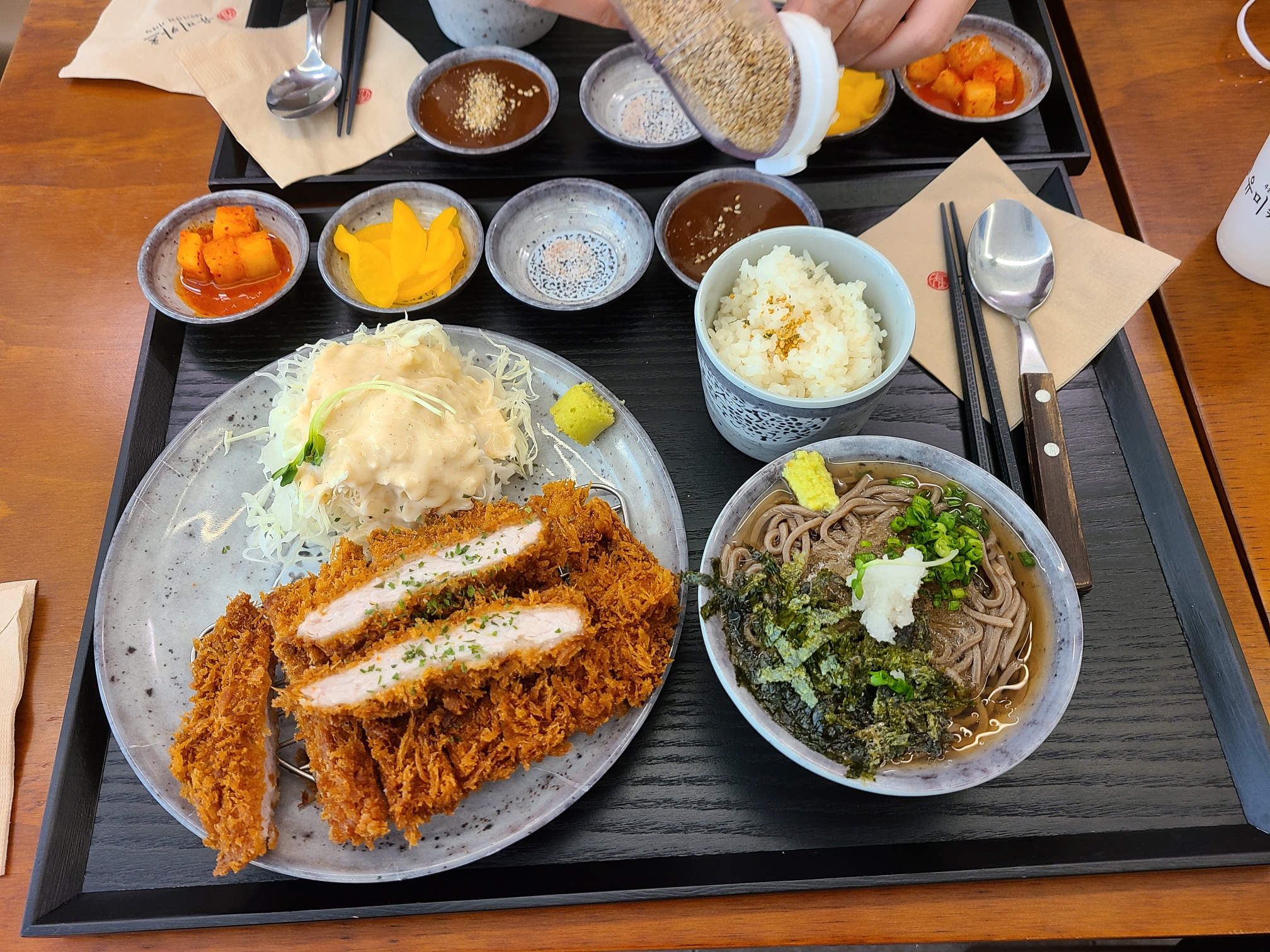 4. 돈가스세트로 주문하고 기다리면 음식이 나옴. 서빙은 해주진 않고 셀프로 갖다 먹어야됨. 마트 푸드코트 시스템임.
