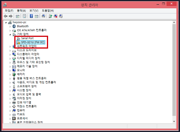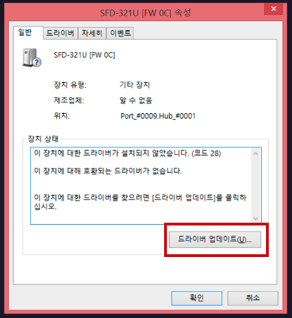 1. 먼저 장치 관리자에 들어가서 'SFD-321U'장치를 더블클릭하여 속성창을 엽니다.