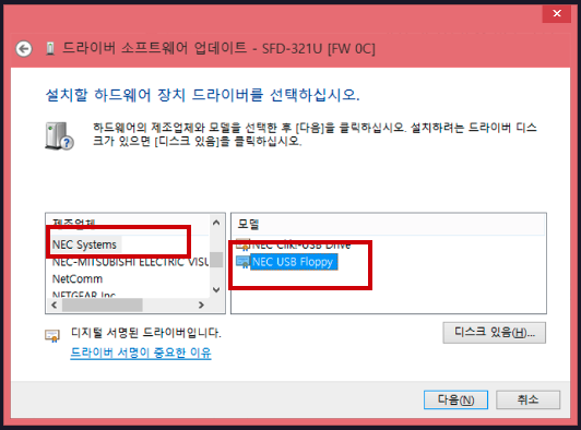 하지만 정보의 바다엔 모든 지식이 담겨 있습니다. 인터넷을 검색해보니 USB 플로피 드라이브는 NEC 드라이버를 강제로 잡아주면 대부분 동작한다는 글을 발견! 설치하니 바로 잡혀서 사용이 가능했습니다.