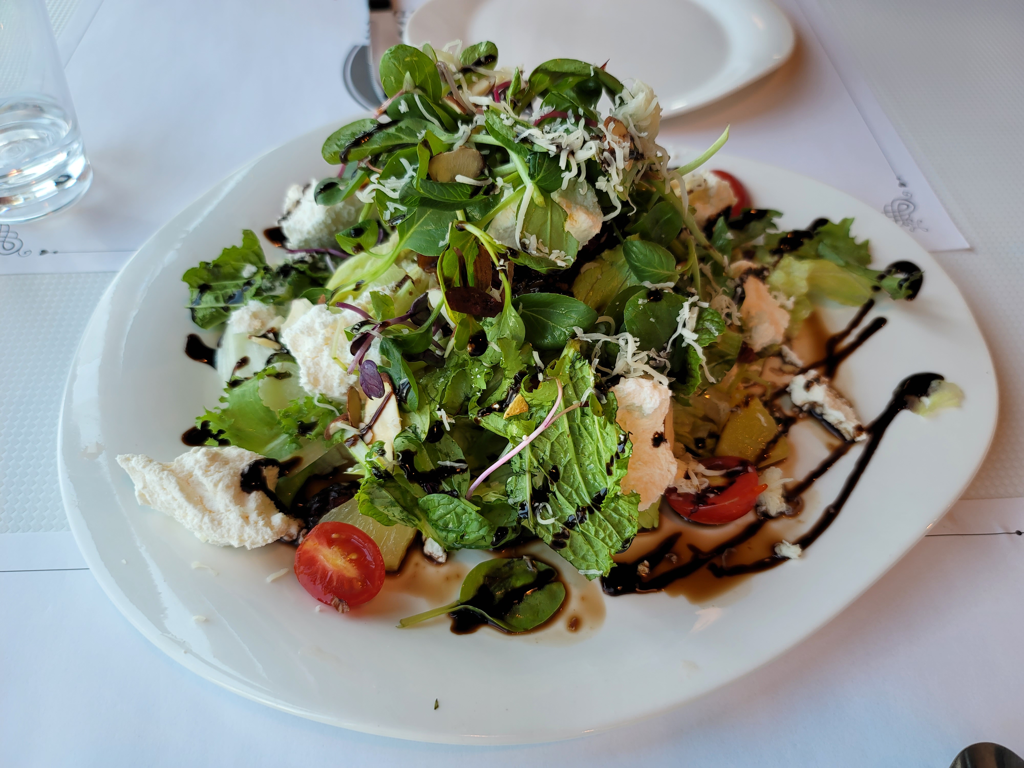6. 샐러드가 나와서 먼저 흡입했습니다. 리코타치즈를 가득 담아 주셨네요. 맥주도 먹고 싶었지만 참았습니다.