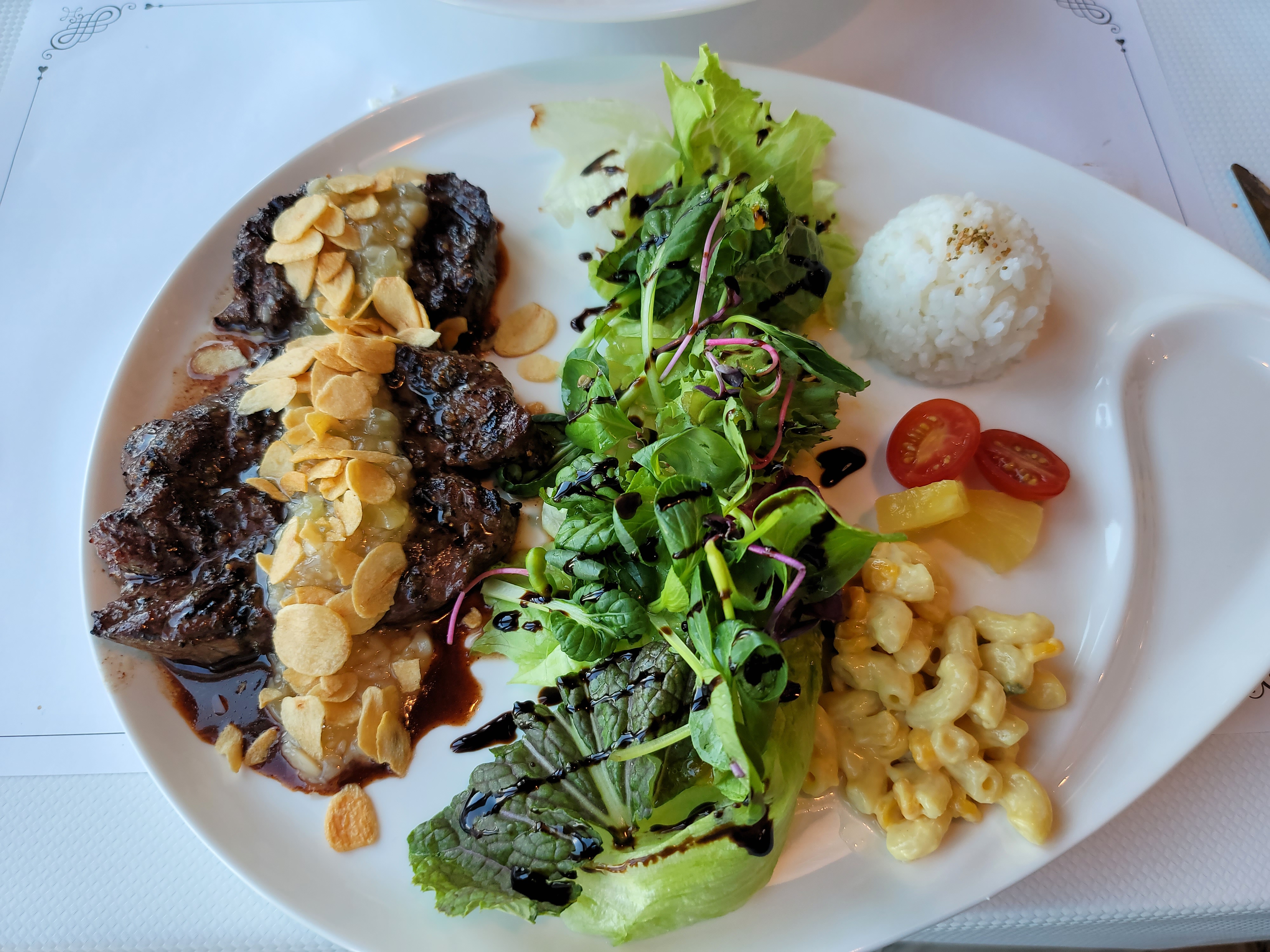 8. 갈릭 스테이크는 밥이랑 샐러드랑 같이 나옵니다. 이럴줄 알았으면 샐러드는 시키지 않는것인데..ㅠㅠ 담에 올때 참고해야겠습니다. 스테이크 굽기 선택할수 있는데 개인적으로 미디엄 웰던이 맛있더라고요. 그리고 고기양도 꽤 많아서 든든했습니다. 위에 뿌려진게 시리얼이 아니고 구운 마늘입니다. 맨처음 나온거 보고 스테이크에 왠 시리얼이 있냐고 생각했네요. ㅋㅋㅋ^^;;;;
