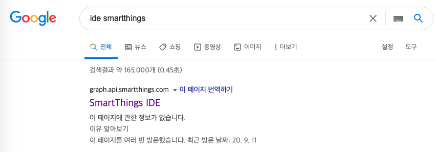 SMARTTHINGS IDE사이트에서 확인이 가능합니다. 먼저 구글에서 SMARTTHINGS IDE라고 입력하고 첫번째 나오는 사이트를 클릭합니다.