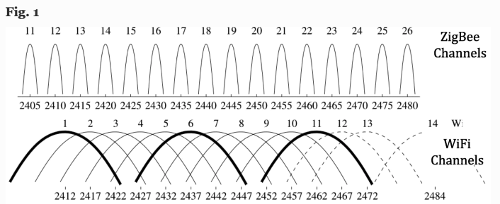 아래 Fig.1에 위에는 지그비 채널, 밑에는 와이파이 채널을 비교하였습니다. 지그비 채널은 11~26까지 총 16개 채널로 운영되고, 와이파이 채널은 국가마다 다른데 한국은 1~13 채널을 사용하고 있습니다. 간단히 생각하면 이 두 통신방식이 겹치지만 않는다면 쾌적한 통신환경을 구축할 수 있습니다. 예를 들어, 와이파이는 1번 채널을 사용하고, 지그비는 26채널을 사용하면 아무 문제가 없습니다^^