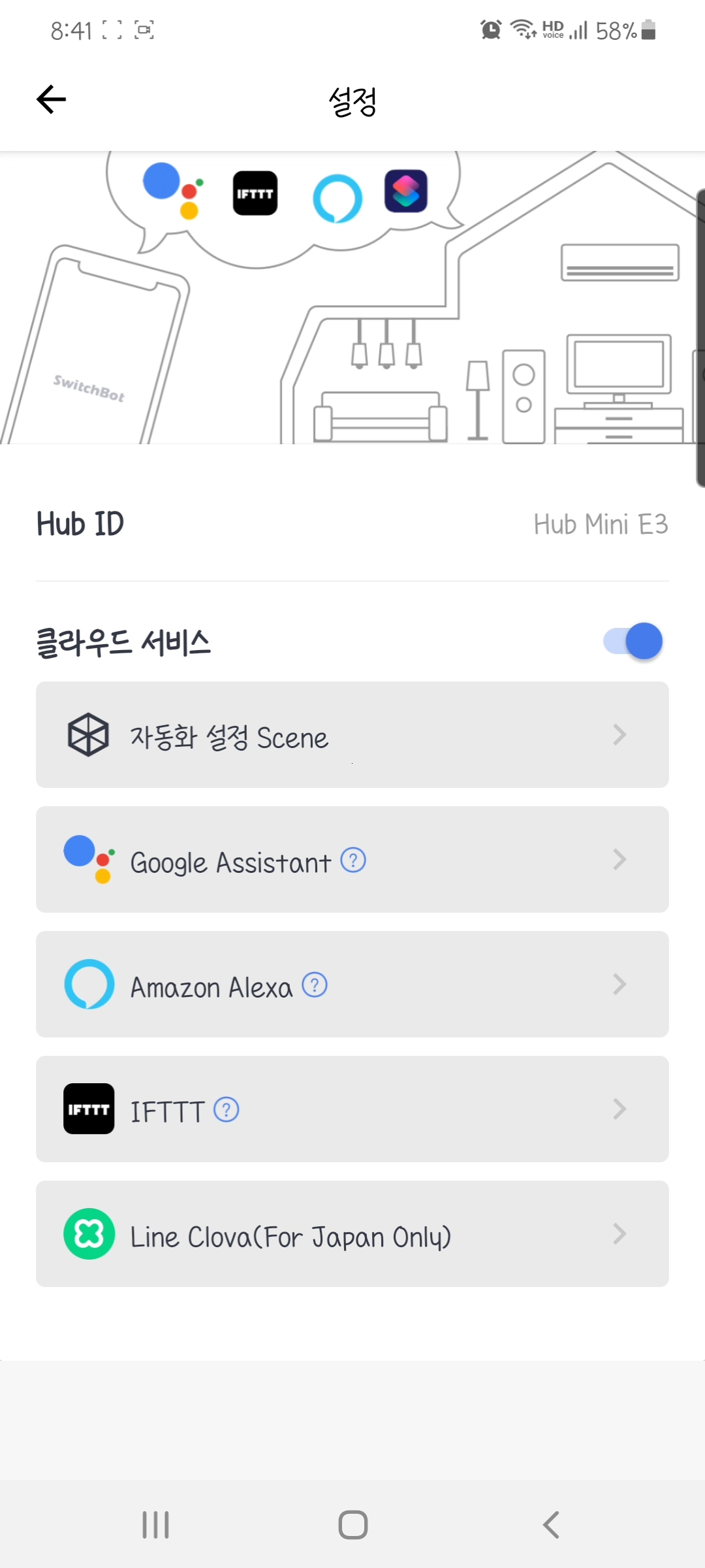 기존 가지고 있던 커피머신 스위치는 아직 클라우드와 연동이 되어 있지 않습니다. 클라우드 연동을 시킬려면 스위치봇 설정버튼을 누른 후 클라우드 서비스를 활성화 시킵니다. 밑에 구글, 뭐 ifttt이런건 클릭 안하셔도 됩니다.