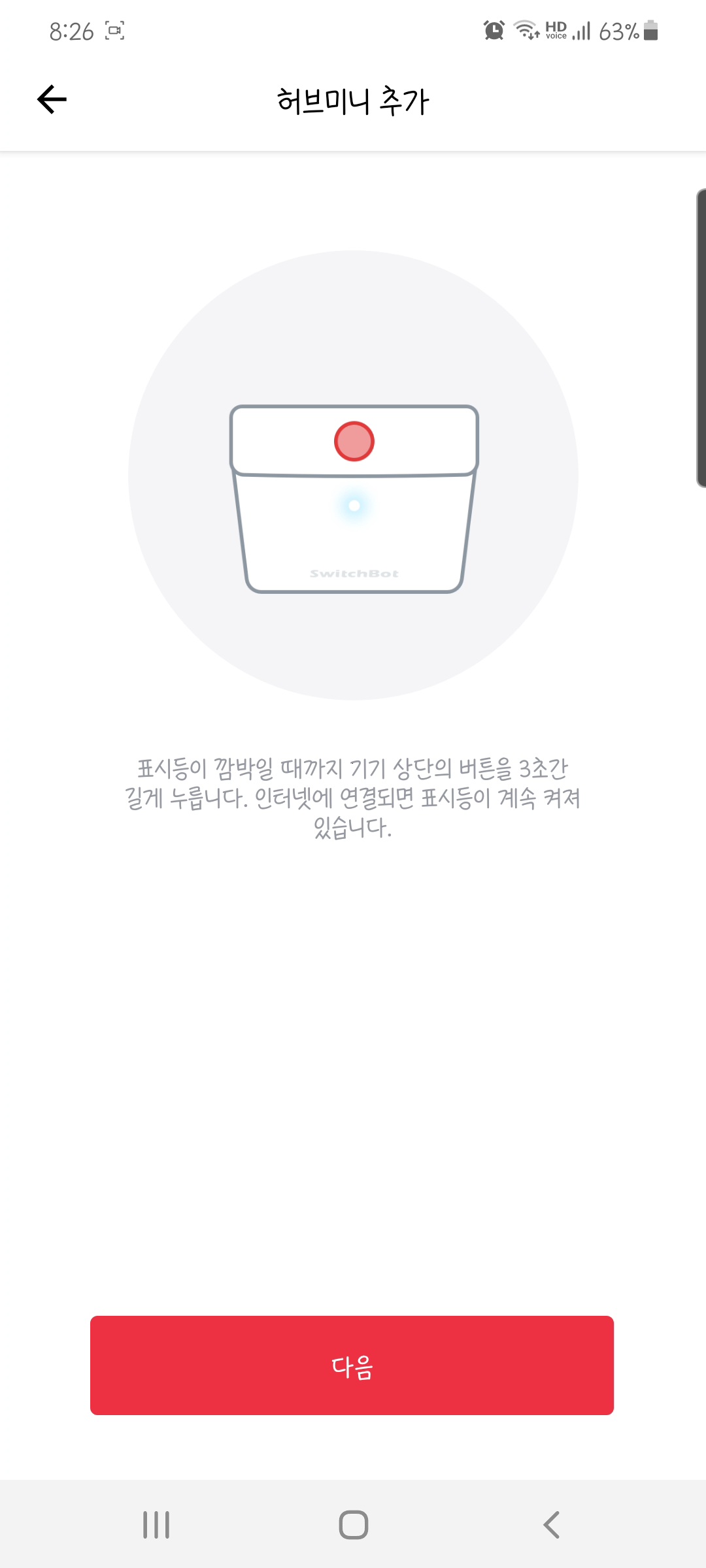 처음 전원이 들어가면 허브의 LED는 점멸로 표시됩니다. 스위치봇 앱을 실행하고 로그인 한 후 기기 등록을 하기위해서 허브의 버튼을 약 3초간 누릅니다. (매뉴얼엔 2초로 나오고 앱에선 3초로 표시 되어 있음) 그럼 앱과 허브가 통신을 하면서 등록합니다.