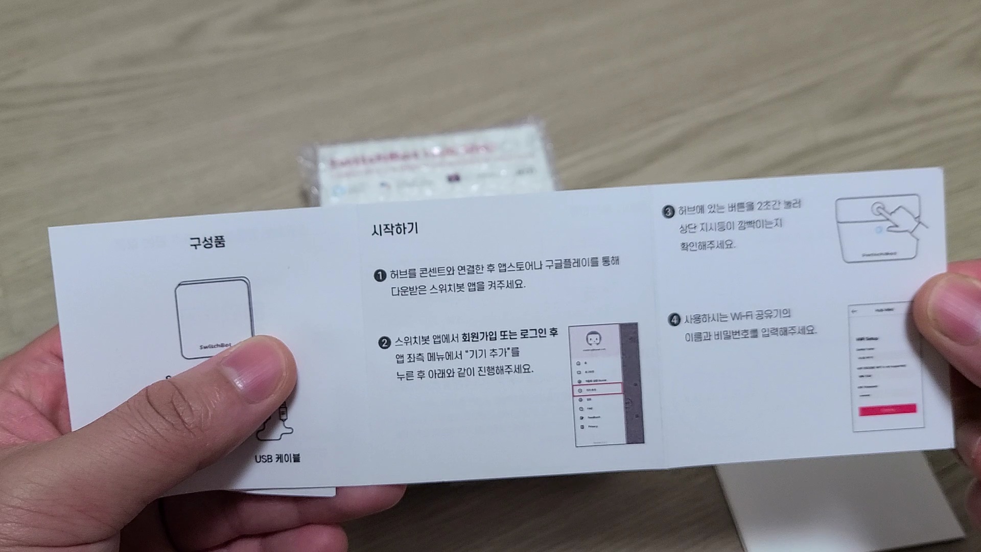 한국 정발판답게 매뉴얼이 한국어로 되어 있었습니다. 회원가입, 스위치봇 앱 설치, 허브 등록하기의 내용이 기재되어 있습니다.