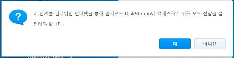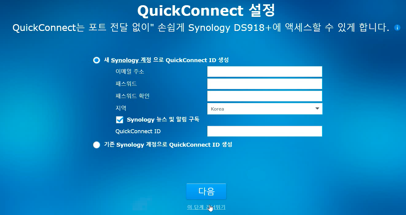 QuickConnect설정 화면이 나오는데 '이 단계는 건너뛰기'를 선택합니다. 우린 정품 유저가 아니기 때문에 절대 생성하지 마세요.