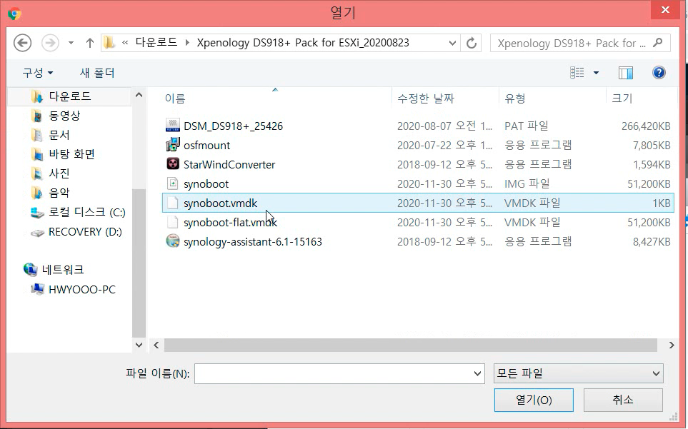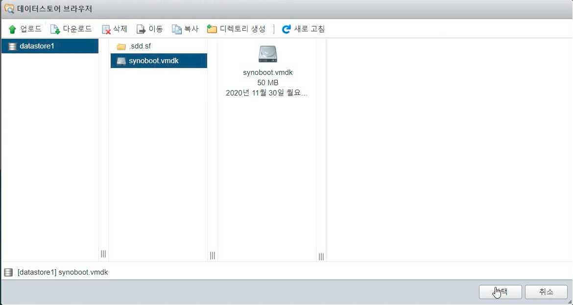 업로드가 완료 되면, synoboot.vmdk 파일을 선택합니다.