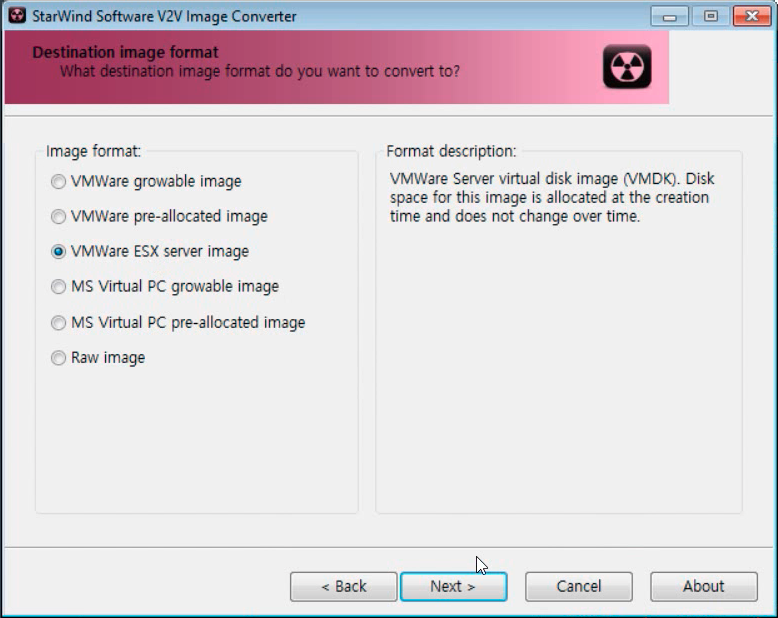 바탕화면에 단축아이콘이 있는데 그것을 더블클릭하여 실행 시킵니다. 그리고 아까전에 저장했던 synoboot.img 파일을 불러옵니다. 그리고 Image Formart을 'VMWare ESX server image'로 선택해 [Next]를 누릅니다. 그러면 변환이 됩니다. 위치는 synoboot.img 와 같은 폴더에 위치해 있습니다.