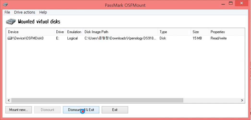 설정을 마쳤기 때문에 osfmount 프로그램에 돌아가서 [Dismount All & Exit] 버튼을 누릅니다. 마운트 해제되는데 괜찮겠습니까? 라고 물어보는데 [예]를 누릅니다.
