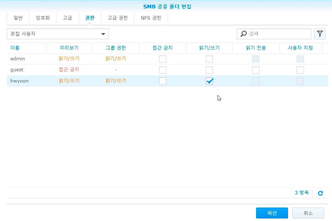 폴더에 어떤 계정 접근이 가능하게 할꺼냐 하는 건데요. 아까전에 생성한 계정에 읽기/쓰기 권한을 부여해줍니다.