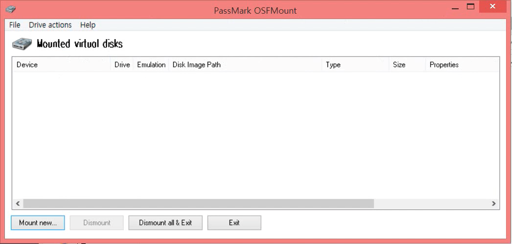 압축을 푼 폴더에서 osfmount.exe 를 설치합니다. 그리고 실행을 하면 아래와 같은 화면이 출력됩니다.