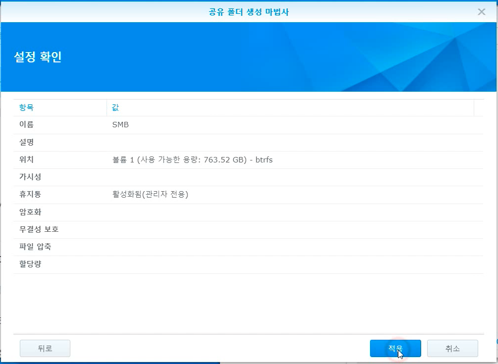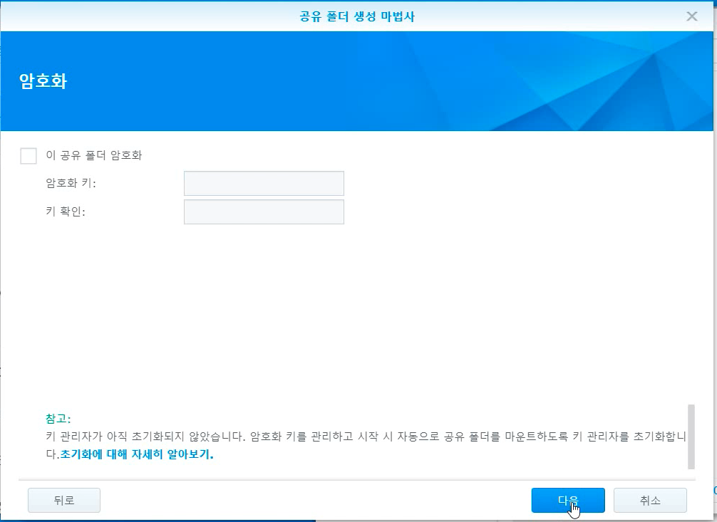 암호화를 적으라고 나오는데...그냥 다음 다음 누릅니다. 그리고 적용을 눌러주면 공유폴더 설정 끝! 간단하죠?