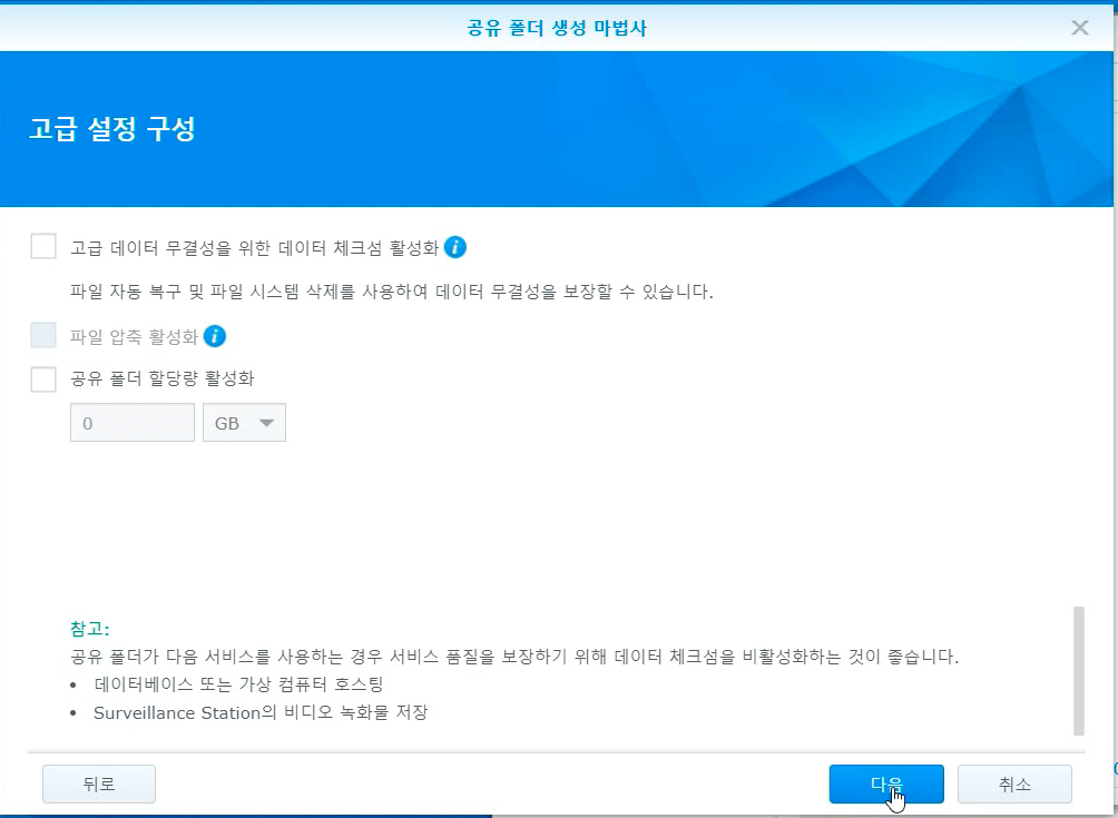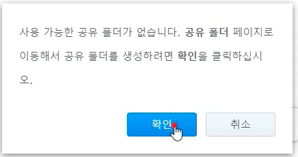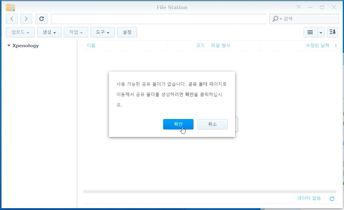 다시 File Station을 엽니다. 그럼 똑같이 공유폴더가 없다고 대화상자가 표시됩니다. [확인]을 누르면 공유폴더 생성 마법사가 실행됩니다.