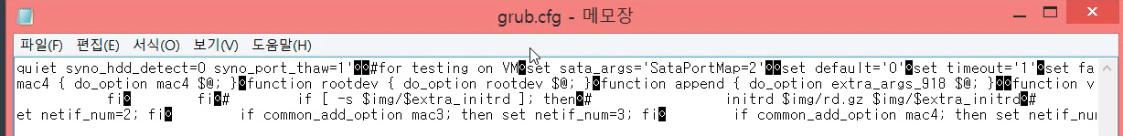 다른 설정들은 설정 변경하지 않아도 괜찮지만, 드라이브 개수 부분은 환경에 맞게 변경해주셔야 합니다. 저는 '시놀로지 부트'와 '가상 하드디스크 1개' 를 사용할 예정입니다. 메모장에서 'SataPortMap'이라고 검색한 후, 4로 되어 있는 부분을 2로 변경하고 저장합니다.(환경에 맞게 실제 사용할 가상 하드 사용할 개수를 적으셔야 합니다!!)