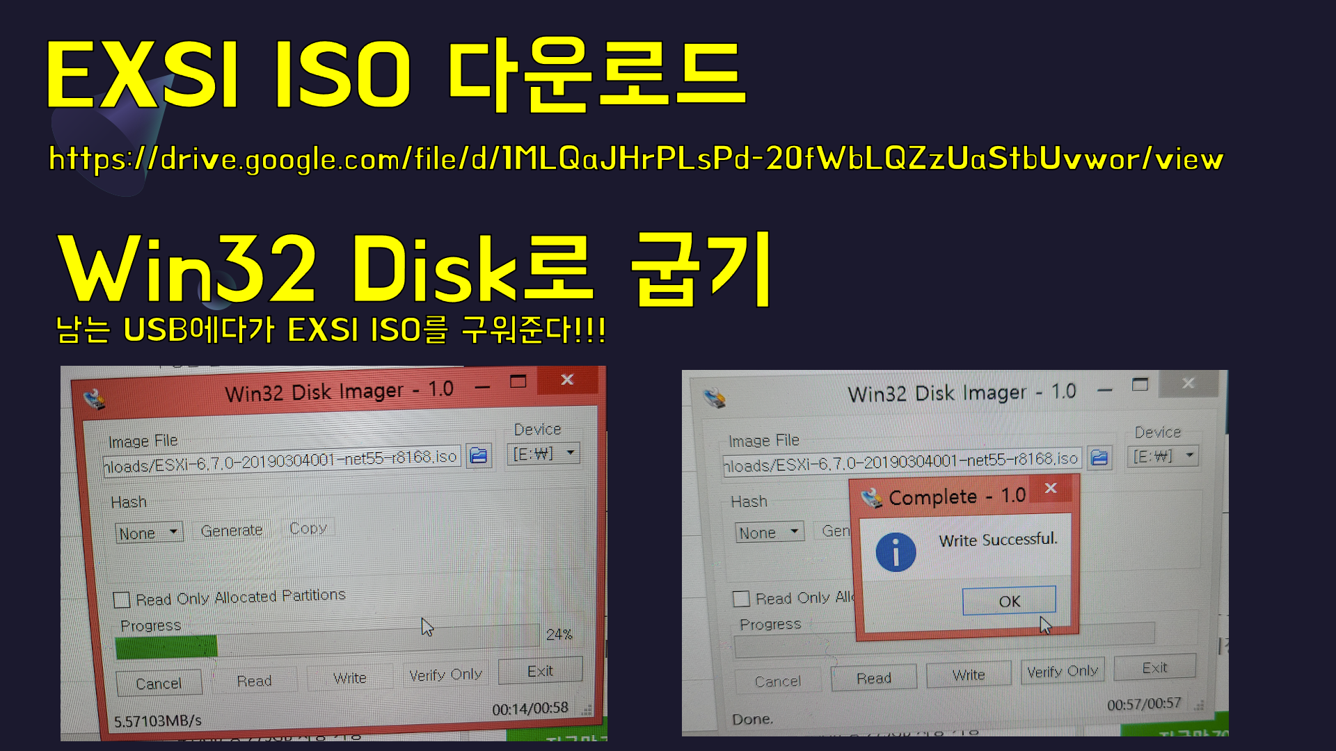 하지만 nuc에 exsi를 설치한다고 생각한사람은 저뿐만이 아닙니다. 우리는 모두 인터넷으로 연결되어 있죠? ㅋㅋㅋ 구글링을 해보니 리얼텍 드라이버가 포함된 exsi iso파일을 공유해놓으신 분들이 계셨습니다. 와우! 그럼 이 iso파일을 Win32 Disk를 이용하여 USB에 구워서 nuc에 끼운후 usb부팅을 해줍니다.