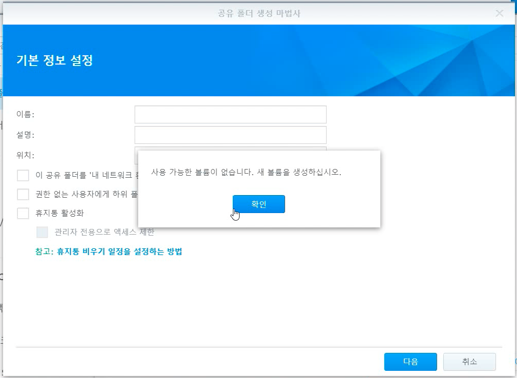설치가 완료되었으니까 초기세팅을 해봅시다. 먼저 File Station 아이콘을 클릭합니다. 그럼 공유폴더가 없다고 설정하라는 메뉴가 표시됩니다. [확인] 버튼을 누르면 제어판의 공유폴더 설정화면으로 이동 되는데 볼륨이 없다고 에러를 뱉어 냅니다. ㅠ_ㅠ 당황하지말고 [학인] 버튼을 누릅니다.