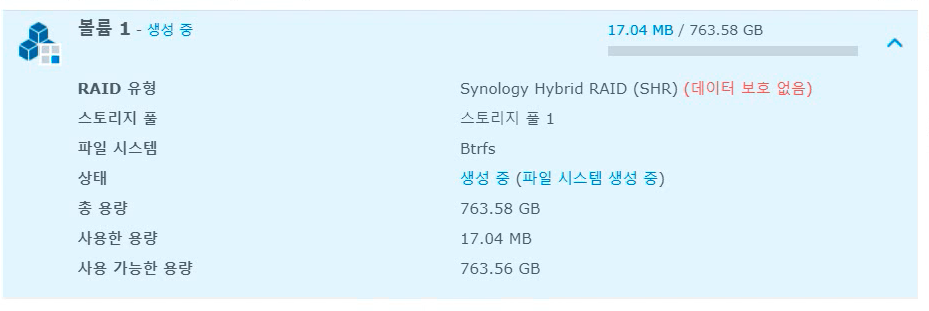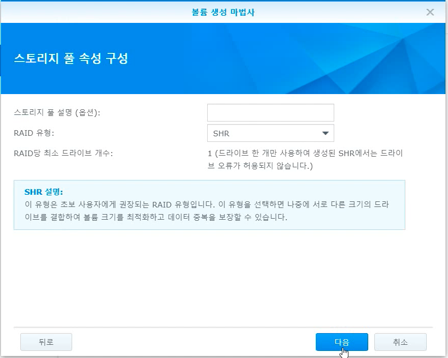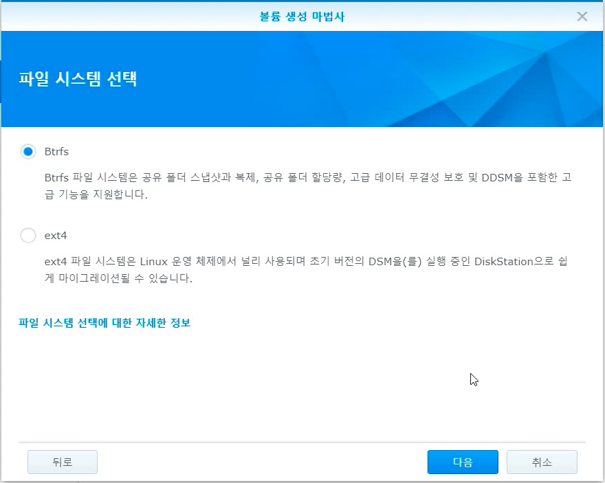 파일 시스템 선택화면이 나옵니다. 모든지 기본값이 제일 좋죠? 시놀로지에서 권장하는 Btrfs로 선택하고 [다음]을 클릭합니다.