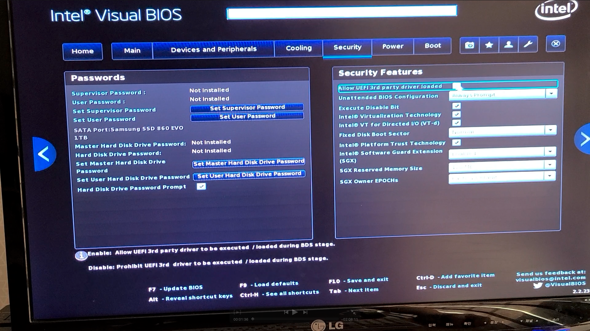 앗! 설치가 될줄 알았는데 설치가 안됩니다. 분홍색 화면에 에러표시내면서 어쩌구저쩌구 써져있습니다. 혹시 몰라서 재기동을 해주었습니다. 결과는 동일...뭔가 바이오스 설정 문제 인것 같아서 바이오스에 들어가 의심되는 메뉴 설정값을 바꿔보면서 조사를 시작했습니다. 그 결과 범인을 찾았습니다. 인증되지 않는 os는 설치못하게 막아버리는 옵션이 있더라고요. 이것을 비활성화하고 기동하니 막혔던 부분이 에러 없이 넘어가게 되었습니다.
