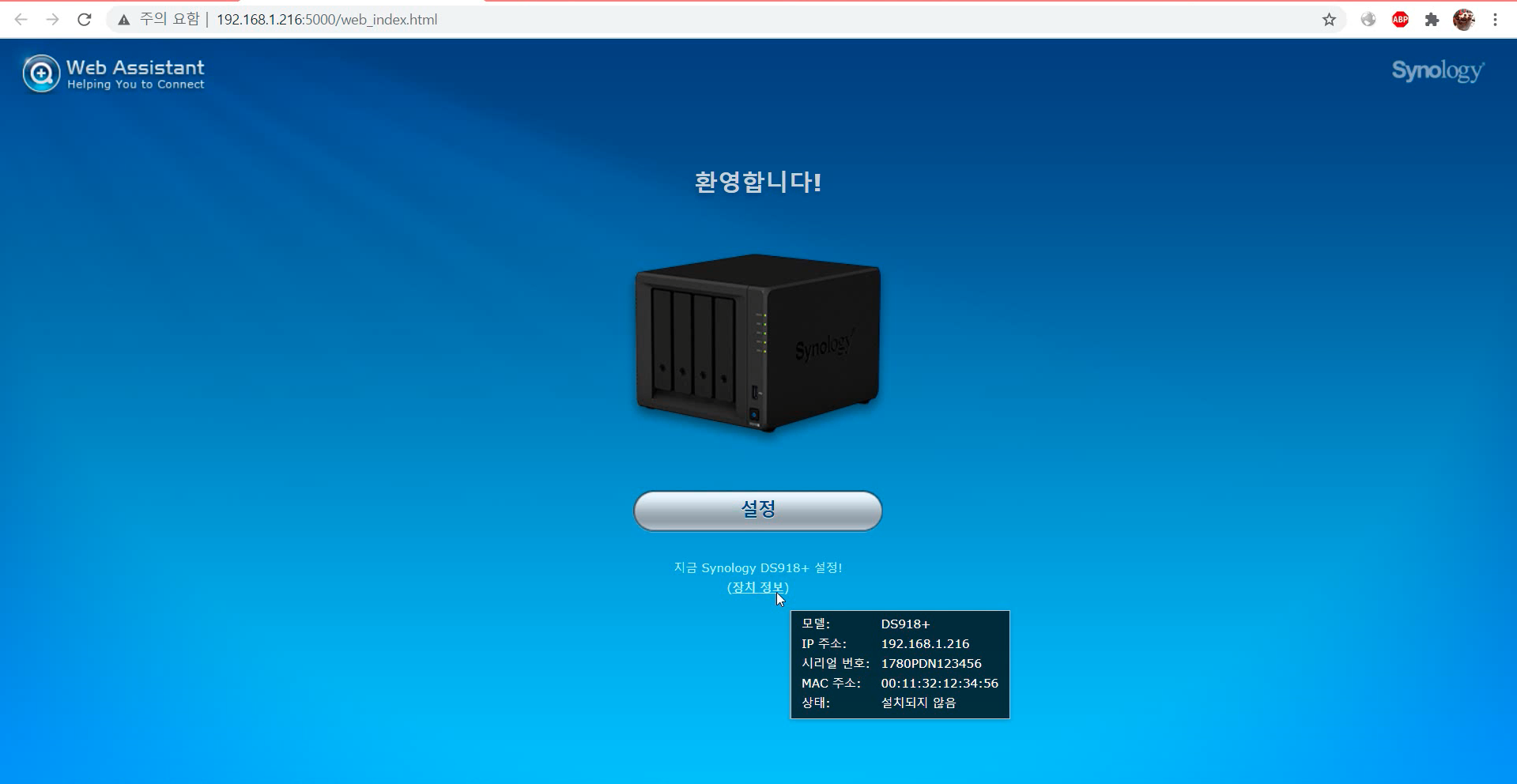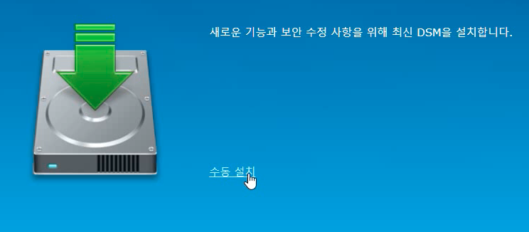 웹브라우저에서 접속하면 아래와 같은 화면이 나옵니다. [설정]을 누른 후, '수동 설치'를 클릭합니다.