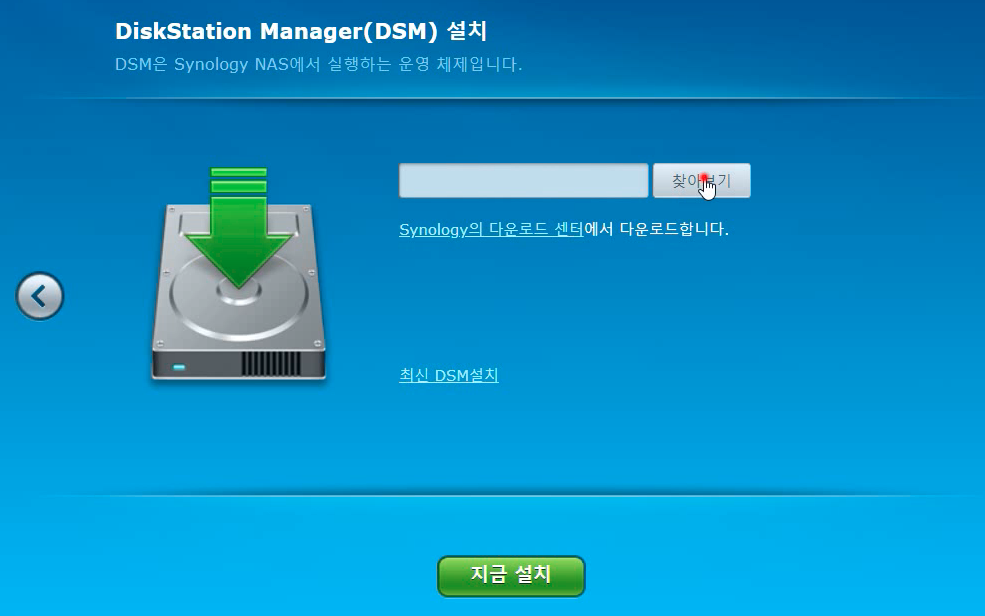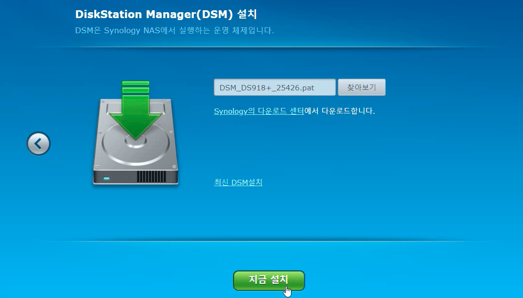 [찾아 보기]를 클릭하고, DSM_DS918+_25426.pat 파일을 선택해줍니다. 그리고 [지금 설치] 버튼을 클릭합니다.