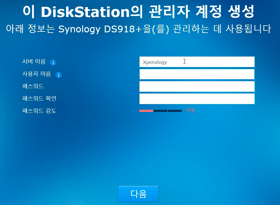 이제 시놀로지 기기명과 계정 생성할 차례입니다. 좋아하시는걸로 입력해주세요. 저는 헤놀로지니까 단순하게 Xpenology라고 적었습니다.