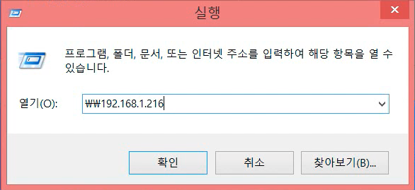 실제 공유폴더가 생성됐는지 확인해 봐야겠죠? 윈도우에서 실행창을 열고 '\\시놀로지주소'를 입력합니다.