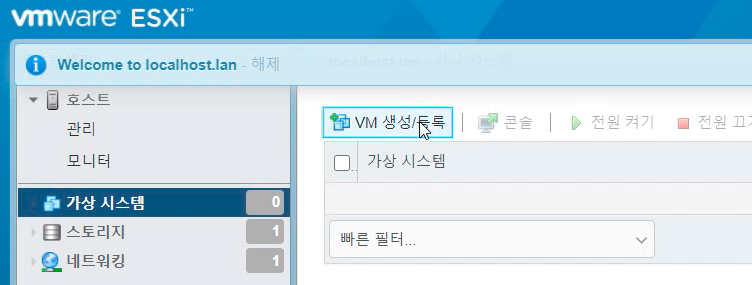 이제 EXSI에서 가상 컴퓨터를 만들어주겠습니다. 웹브라우저에서 EXSI로 들어가서 로그인을 한 후, '가상 시스템' 메뉴를 클릭 하고, [VM 생성/등록]을 클릭합니다.