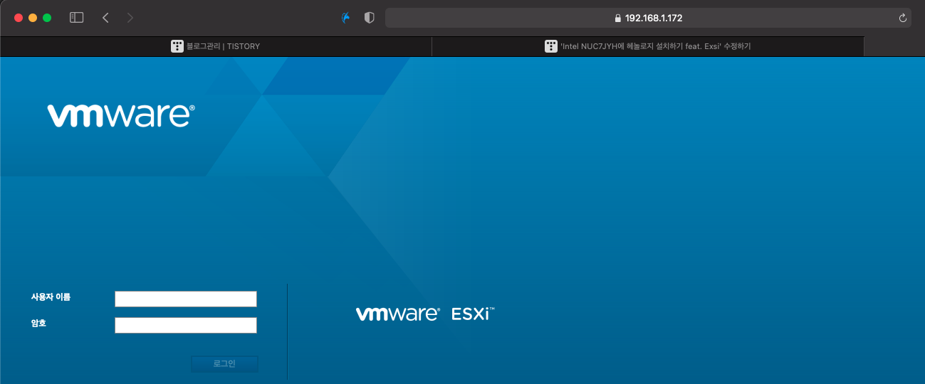 exsi는 약 512메가 램을 사용합니더. exsi로 부팅후 다른 컴에서 웹브라우저로 exsi에 접속하여 가상피씨를 만들어 줄수 있습니다! 게다가 개인이 vmware 홈페이지에 가입하면 라이선스도 무료로 얻을수 있습니다. 무료 라이선스이기때문에 제약이 있긴한데 구입한 nuc로는 제한 없이 사용가능합니다.(cpu코어 이런거 제약이 있는데 nuc는 저사양피씨라....제약이 없어짐 ㅡ.ㅡ)