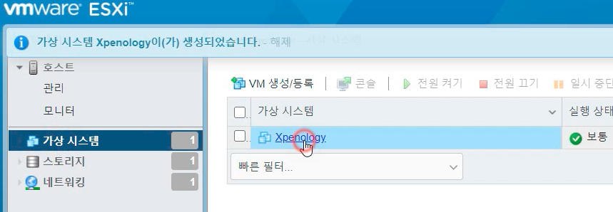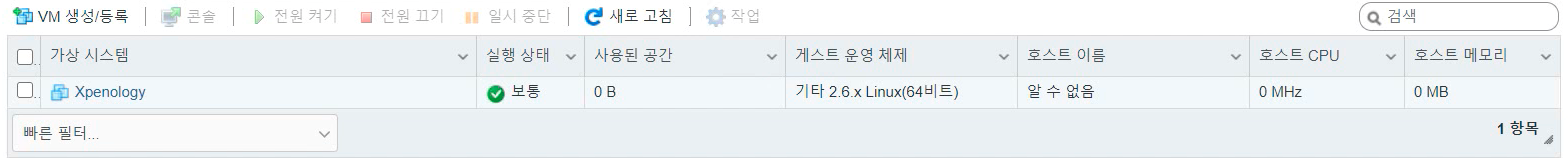 이제 가상 컴퓨터를 기동시켜 보겠습니다. Xpenology를 클릭하면 상세 메뉴가 나오는데 [전원 켜기] 버튼을 누릅니다.