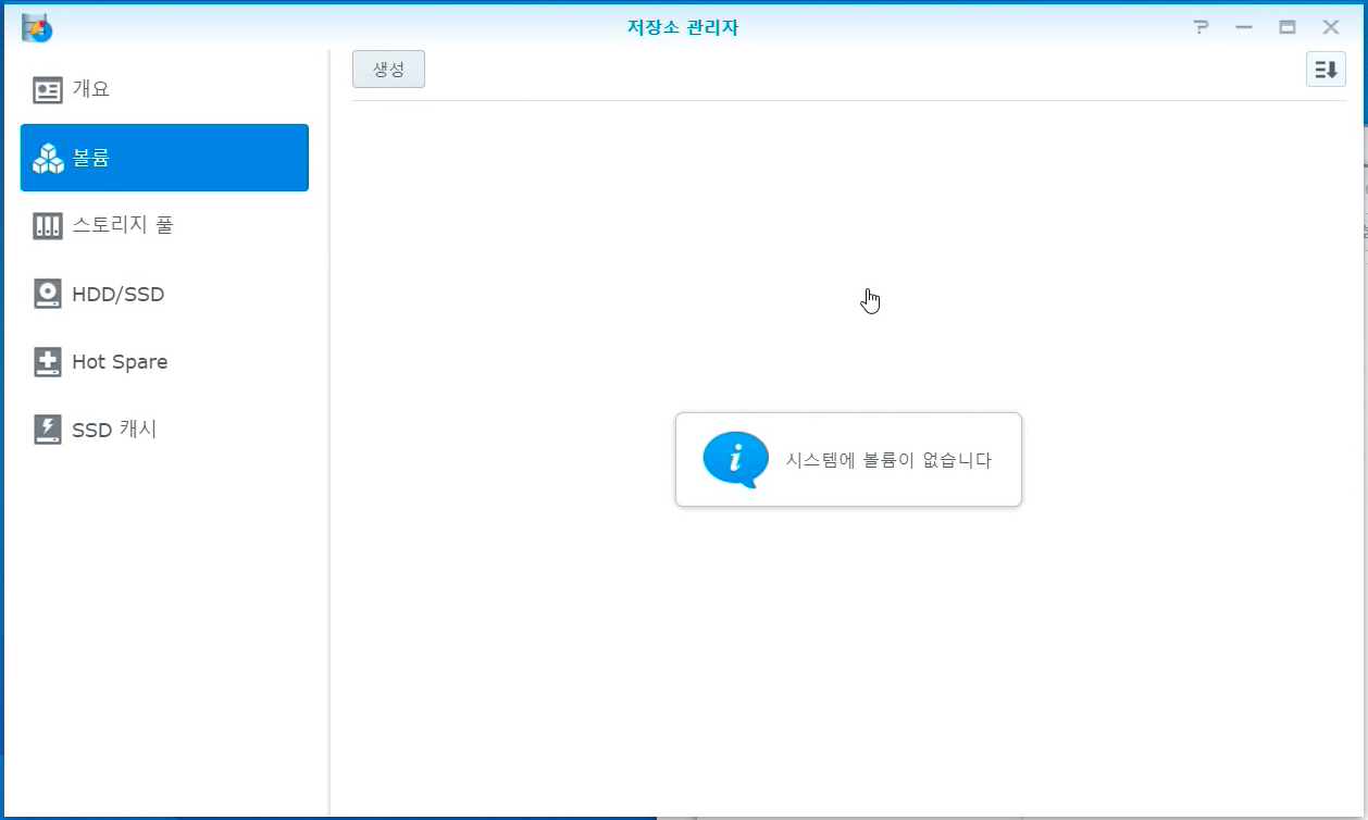 그럼 저장소 관리자로 이동됩니다. 그렇습니다. 우린 디스크는 추가되었지만, 볼륨(윈도우에서 파티션 같은거)이 없던 것이였습니다. 볼륨을 만들어주어야 합니다. '볼륨'을 누릅니다. 그리고 [생성] 버튼을 클릭합니다. 그냥 다음 다음 눌러줍니다.
