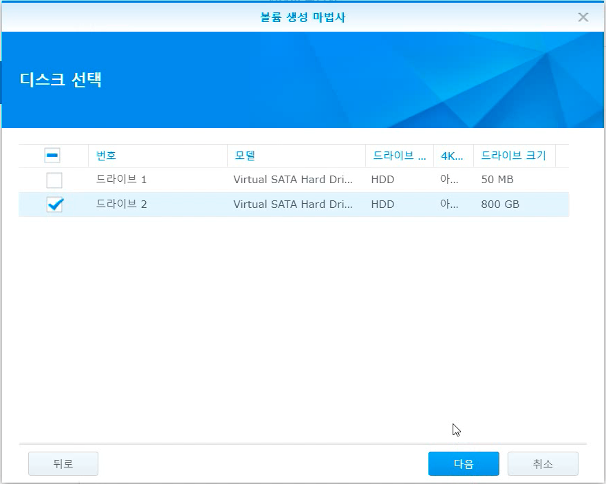 여기서 중요!! 절대 드라이브1을 선택하시면 안됩니다. 아까 설치할때 0번 디스크는 부팅 디스크이고 1번이 데이터 저장용 디스크였죠? 두번재 800GB로 선택한다음 [다음] 버튼을 누릅니다.
