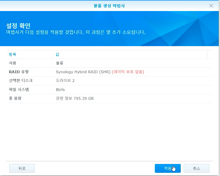 설정을 확인한 후에 [적용] 버튼을 누르면 끝입니다.