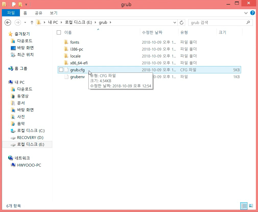 그럼 윈도우 드라이브로 인식하게 되는데 윈도우 탐색기를 열어서 grub 폴더로 진입 후, 메모장에서 grub.cfg 를 열어줍니다.